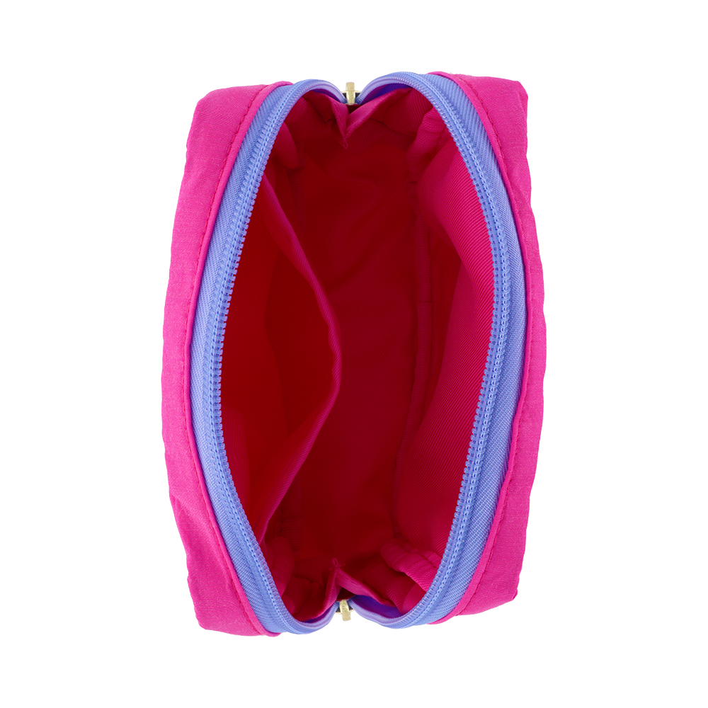 ピンクのミニポーチは、ファスナー部分にライトブルーを組み合せたデザイン。