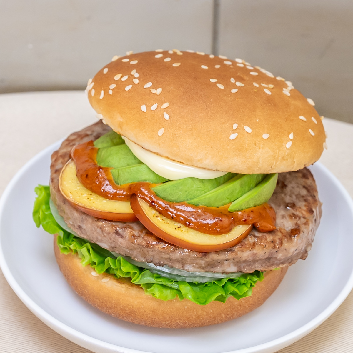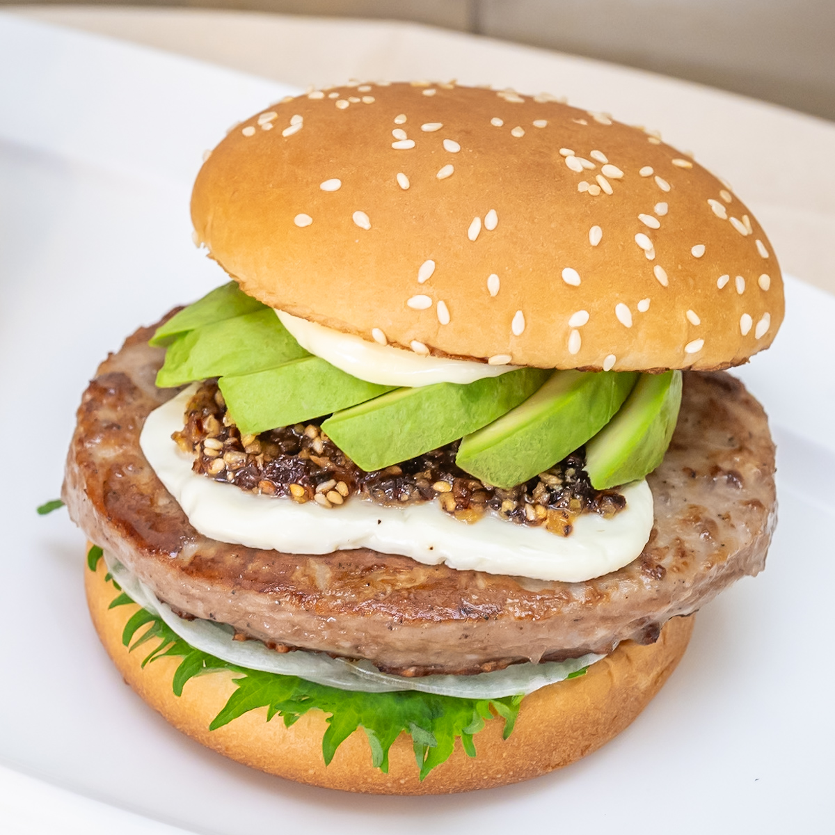 某TV番組で超一流料理人から満場一致合格を獲得した人気メニュー「クラシックアボカドクリームチーズバーガー~わさび香るサクサク醤油~」