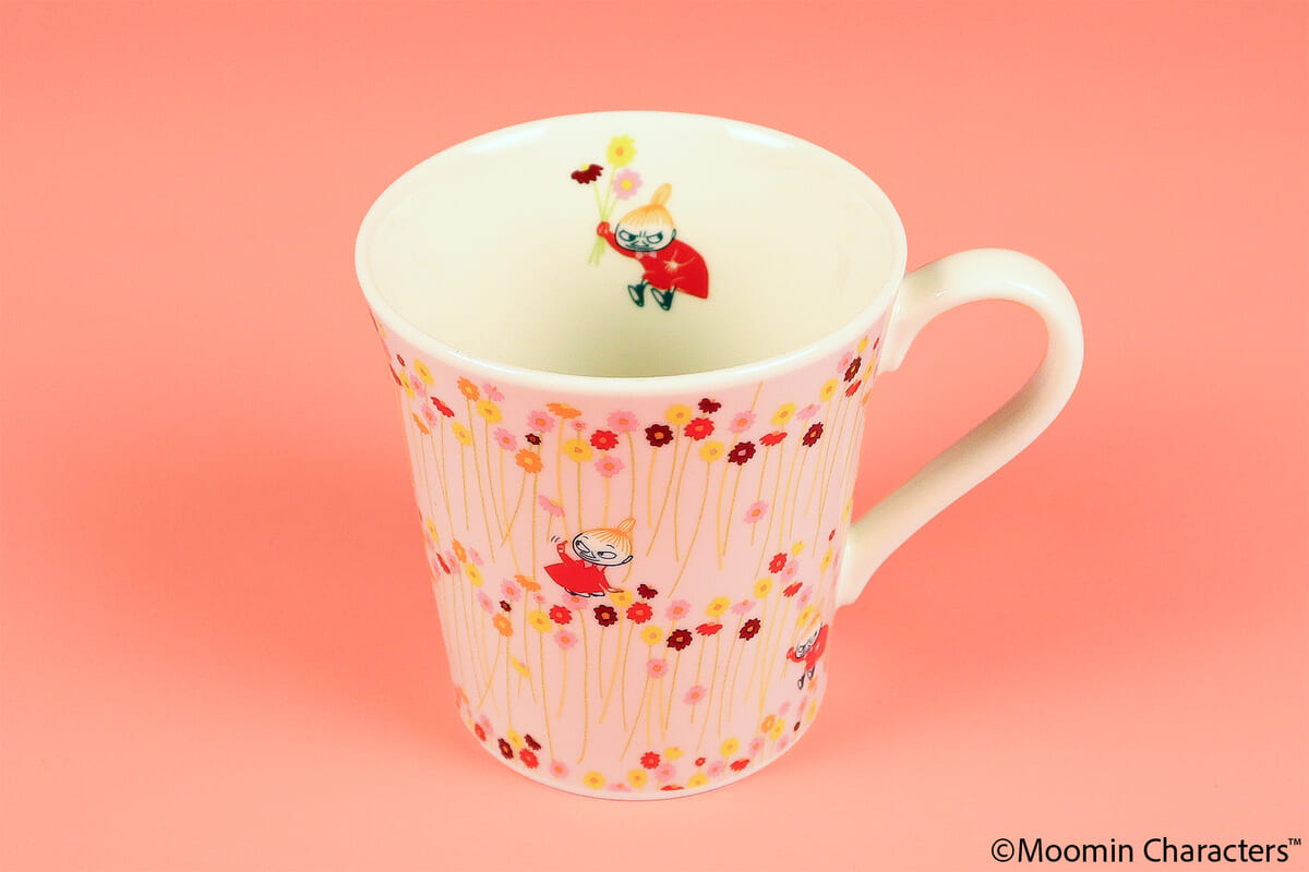 全体にお花畑が広がり、その中に「リトルミイ」がひょっこり隠れているような遊び心あふれるデザインのマグカップ。