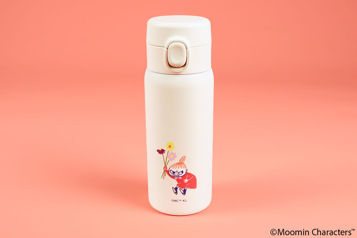 お花を持ってジャンプする「リトルミイ」のアートが印象的なデザインのステンレスボトル。