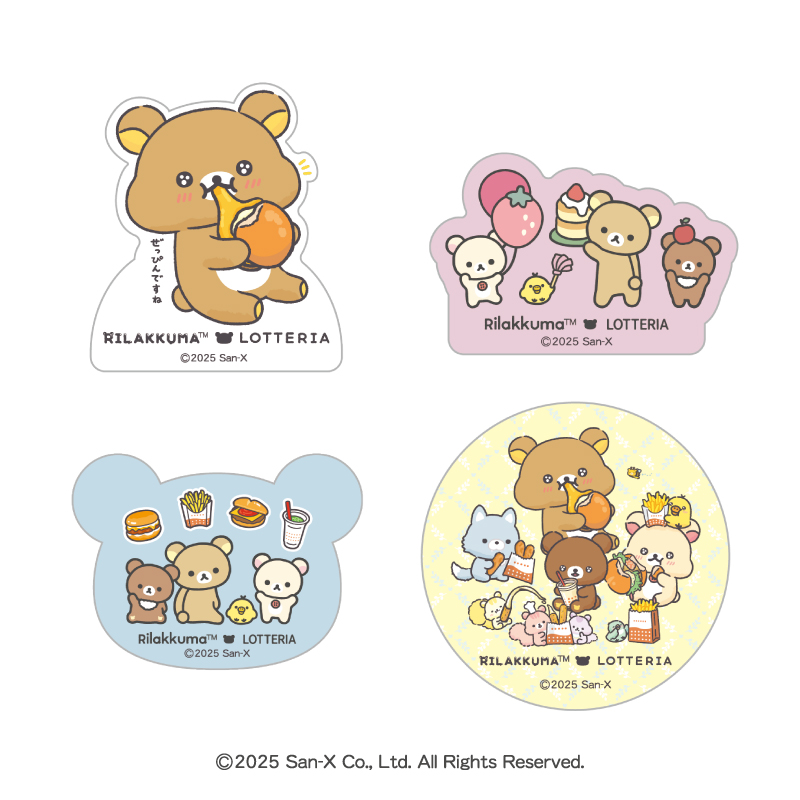 「BASIC RILAKKUMA Favorite Things」シリーズのデザインが2枚、ロッテリア限定の描き下ろしデザインが2枚の計4種入りです。