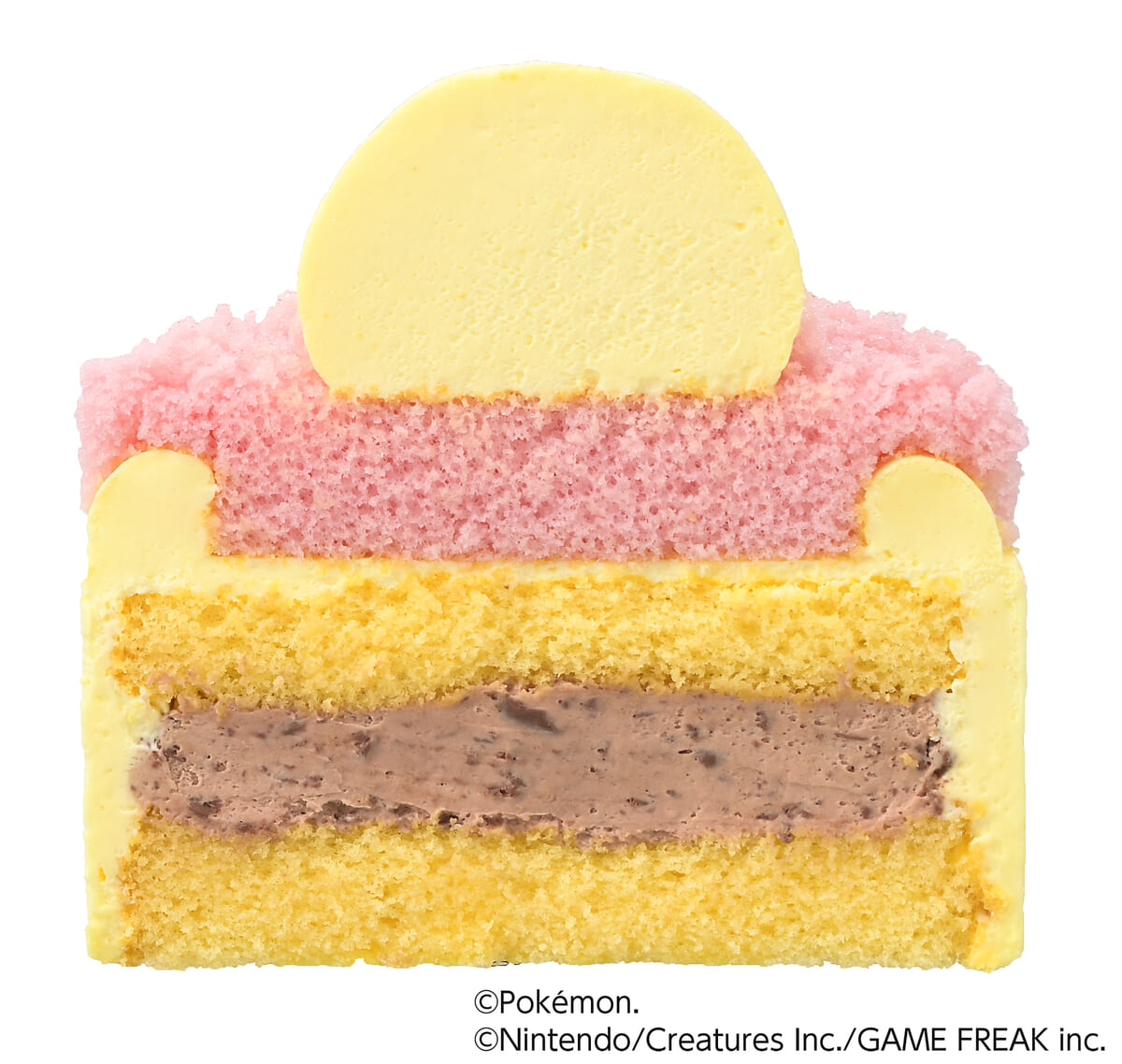 ふわふわのバナナスポンジでチョコクリームをサンドし、バナナクリームで仕上げたピカチュウのまわりには、ふわふわの苺風味スポンジが散らしてあります。
