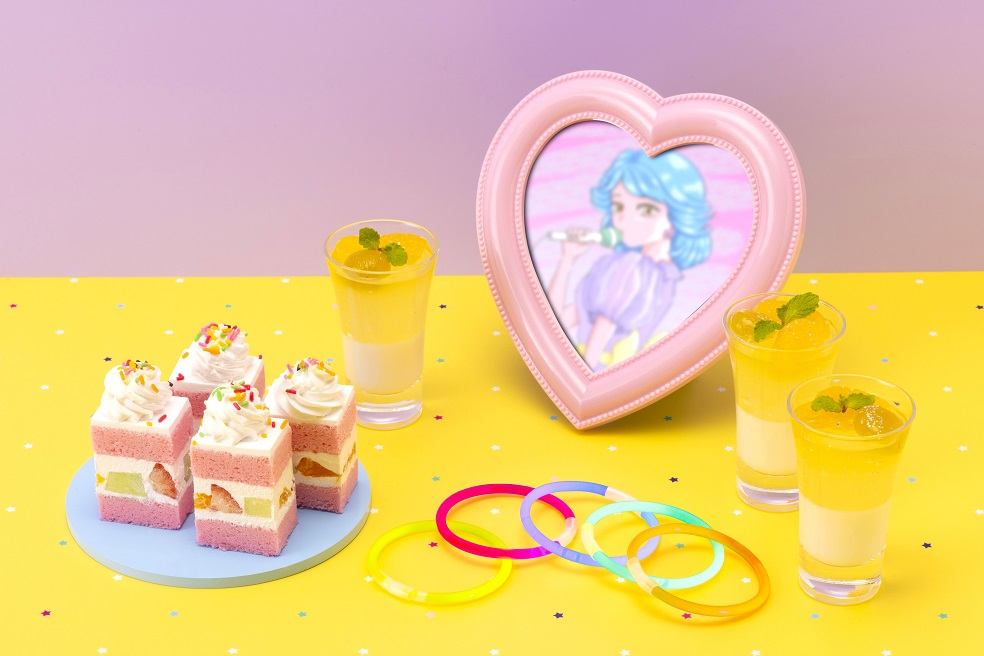 カラフルなペンライトをイメージしたスイーツで現代のファン文化を象徴し、昭和のアイドル文化と現代の推し活文化が融合。
