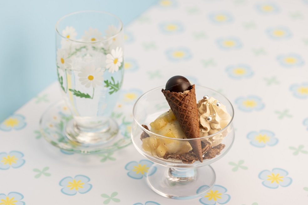 さらに、グラスのトップにはパリパリ食感が楽しめる薄い飴と、アイドルの髪飾りに見立てた星形のチョコ、さくらんぼをトッピング。