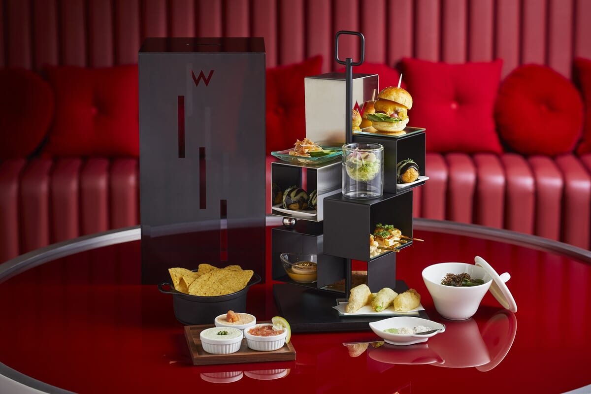 ラグジュアリー・ライフスタイルホテル「W大阪」にて、2024年10月より人気お笑いコンビ「はるかぜに告ぐ」監修の、夜限定のおつまみアフタヌーンティーBOXを提供中。