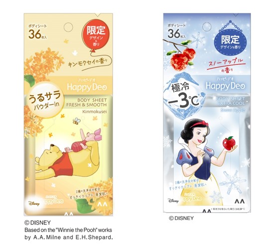「くまのプーさん」と「白雪姫」デザインの「マンダム ハッピーデオ ボディシート 限定品」が、数量限定で登場。