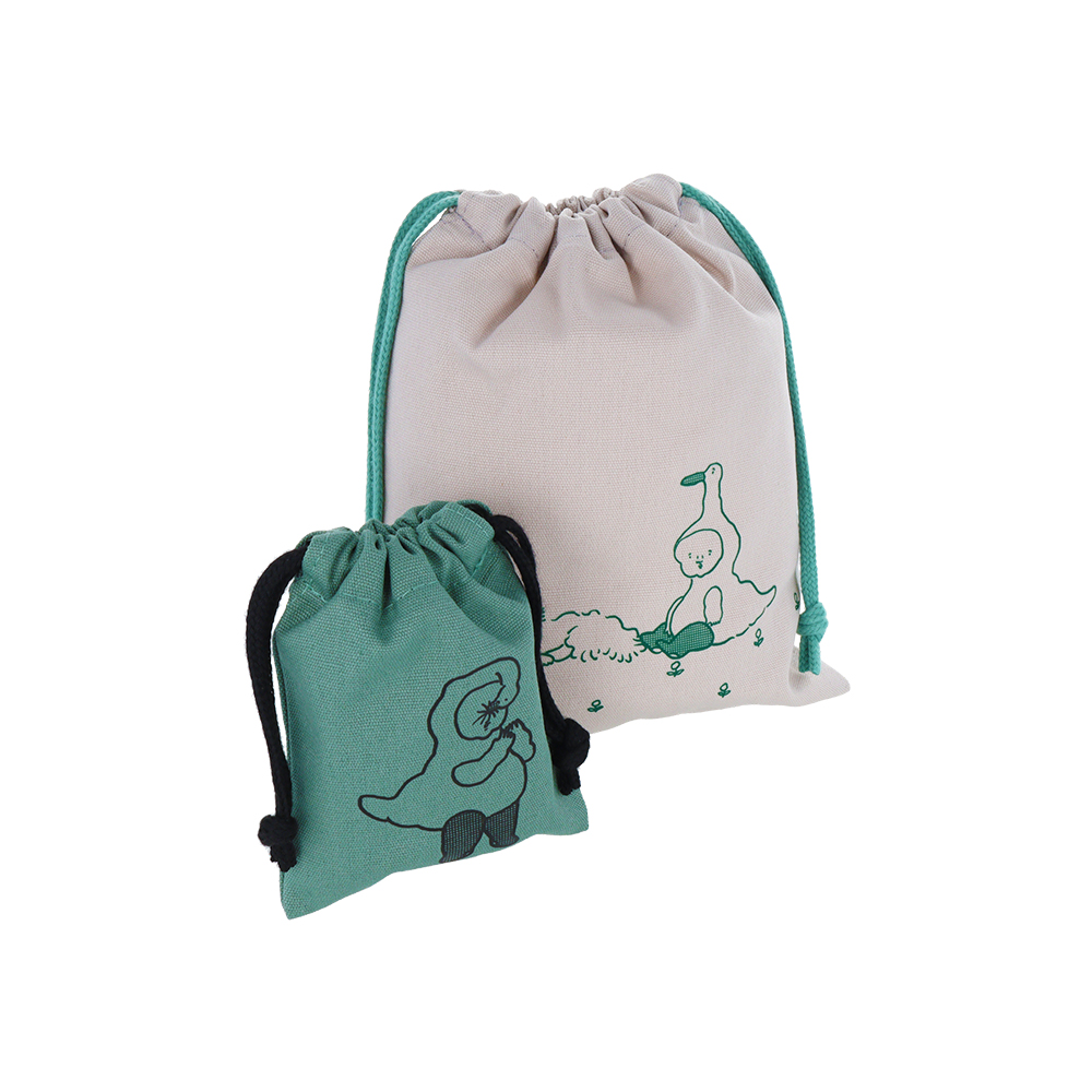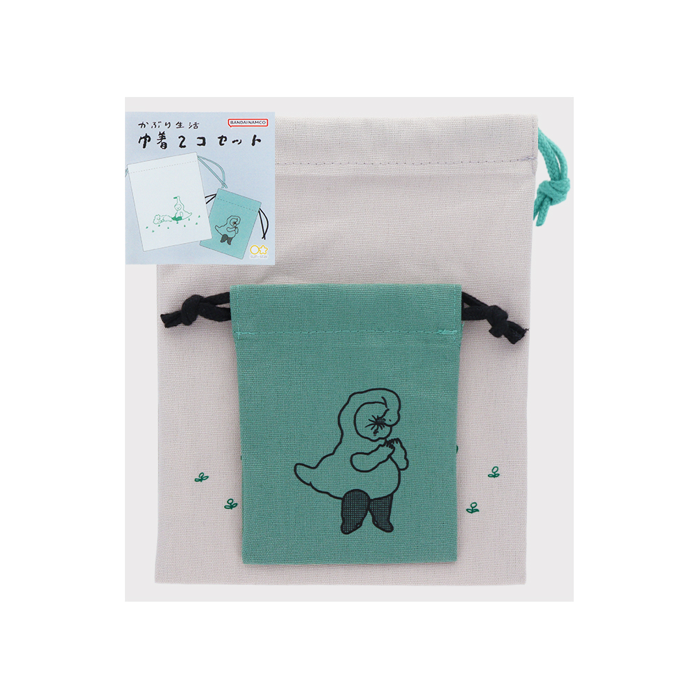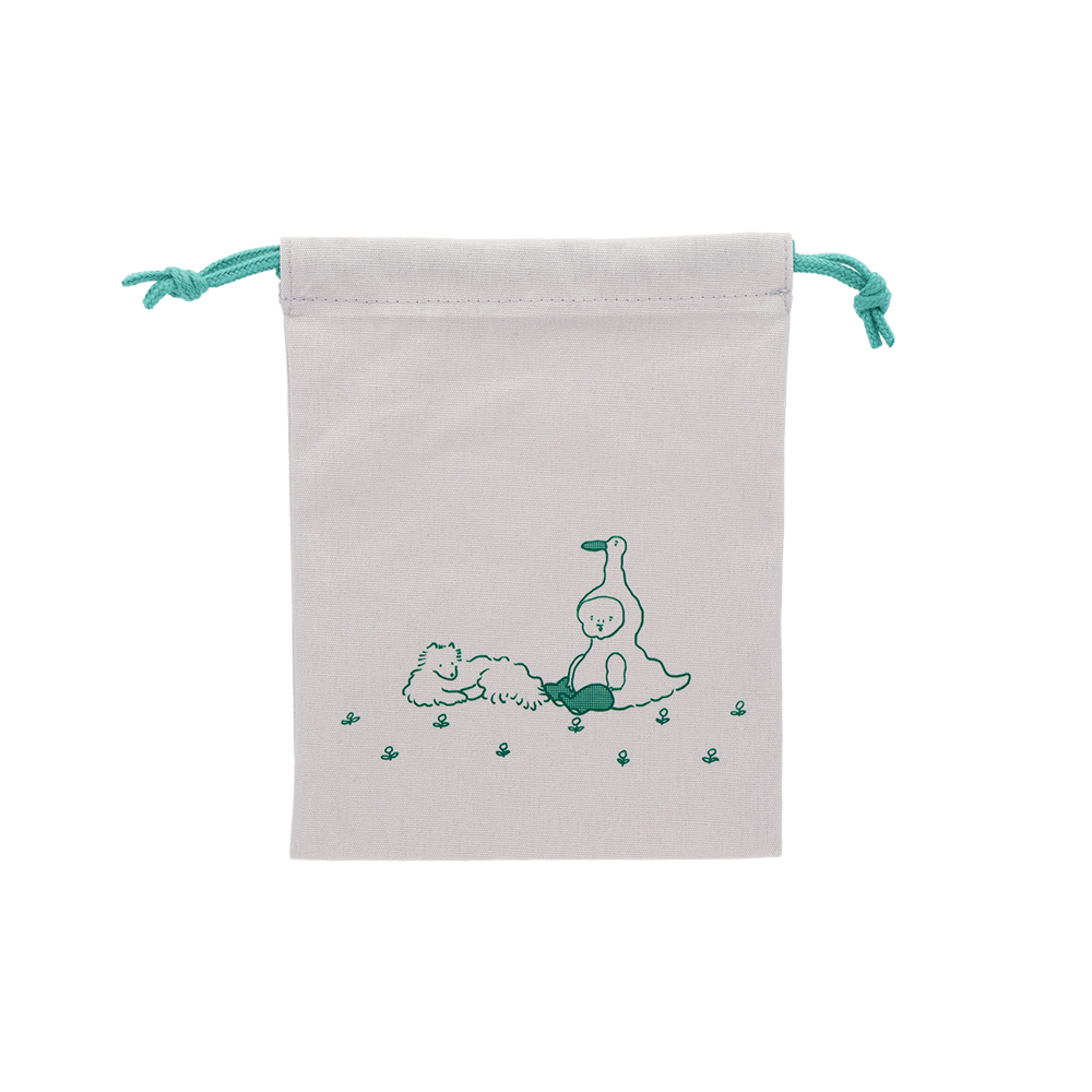 大サイズの巾着には、お座りする「アヒル」と「もうふ」