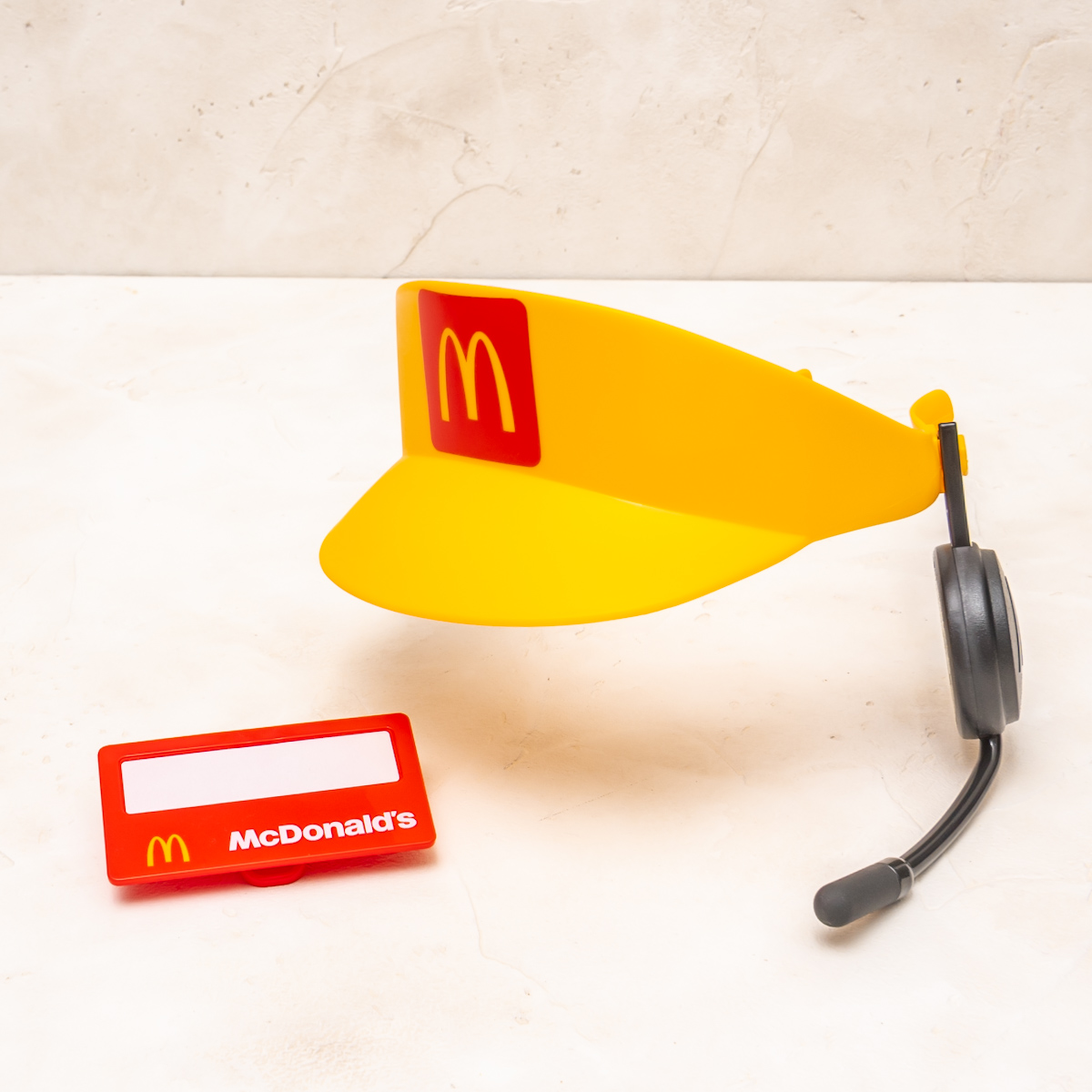 サンバイザーとマイク、ネームバッジをつけて、ドライブスルーの注文を受けるクルーになりきることができるセット。