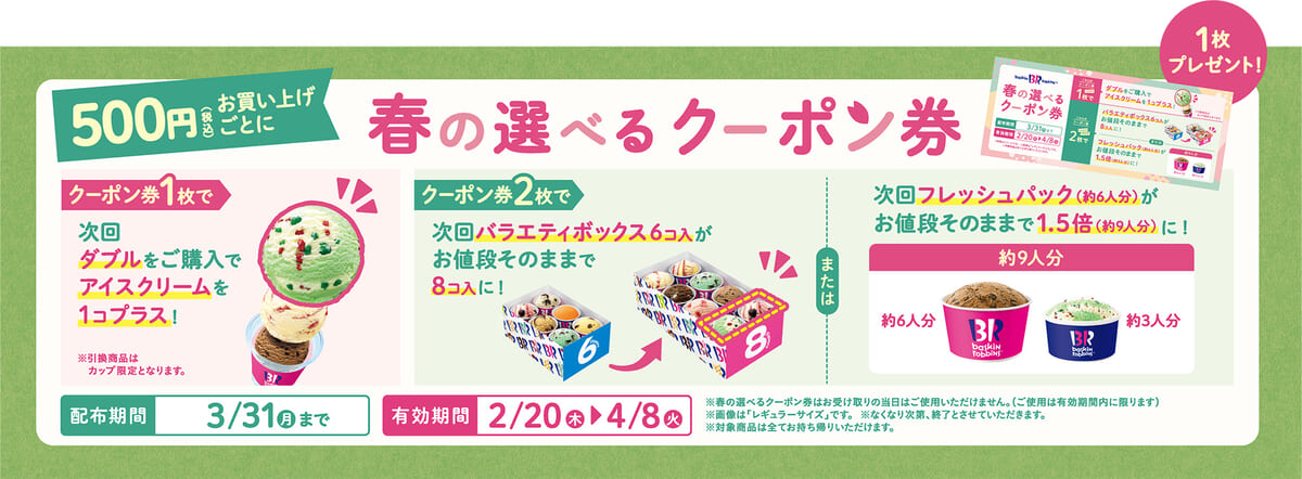 期間中500円(税込)購入ごとに、春の選べるクーポン券を1枚プレゼント!