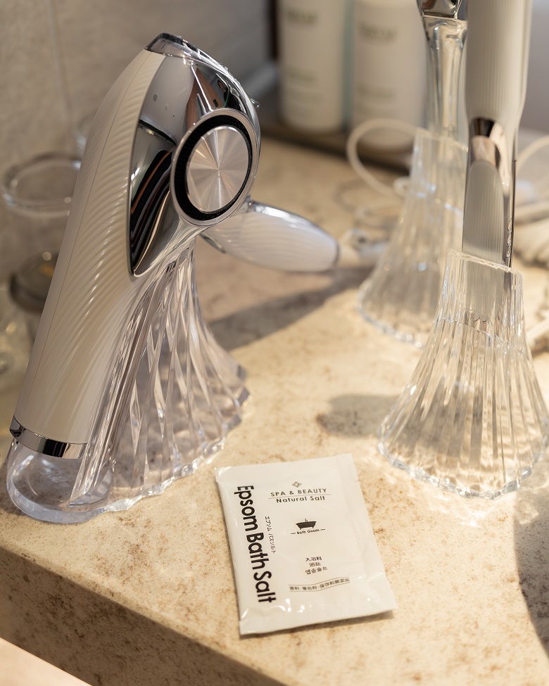 お部屋には人気のローズシリーズの中から「ローズ シャワージェル 30mL」「ローズ ボディオイル 10mL」「RO フェイスオイル 9mL」がセットになったジュリークの限定アメニティが用意されています☆