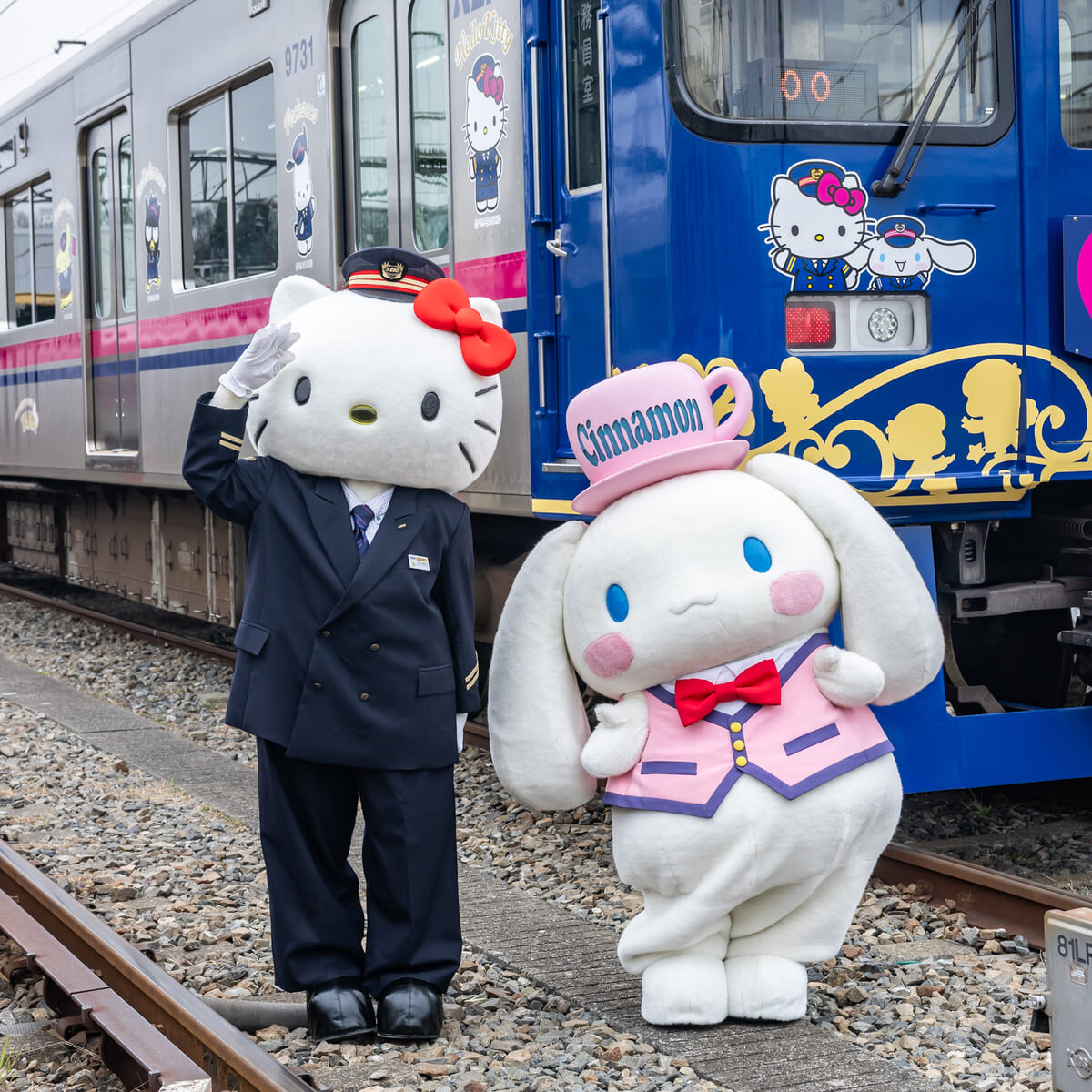駅長コスチュームのハローキティとシナモロールが登場。