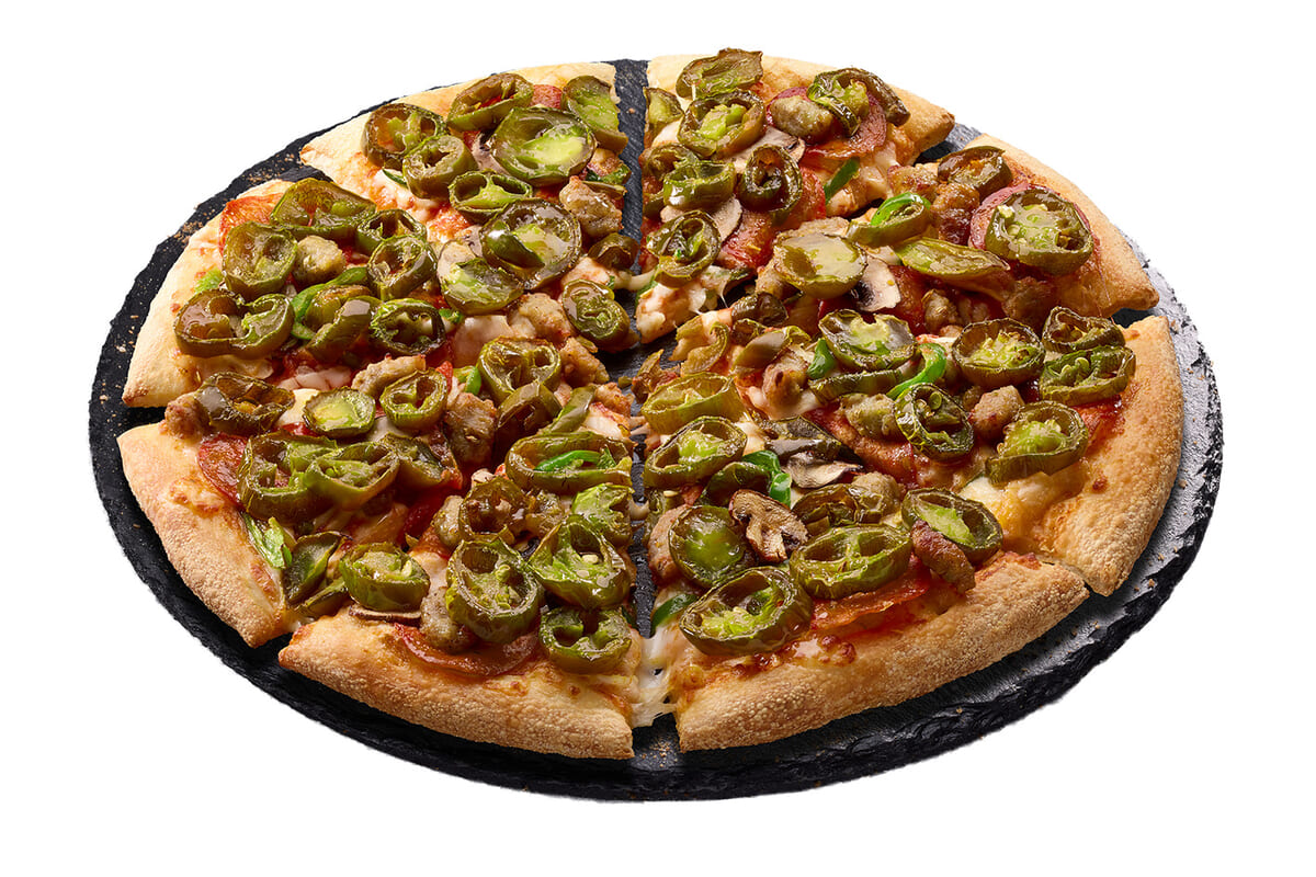 トッピング:ペパロニ、イタリアンソーセージ、マッシュルーム、ピーマン、オニオン、トマトソース、モッツァレラチーズ、ハラピニオ(通常商品のトッピングの2倍量)