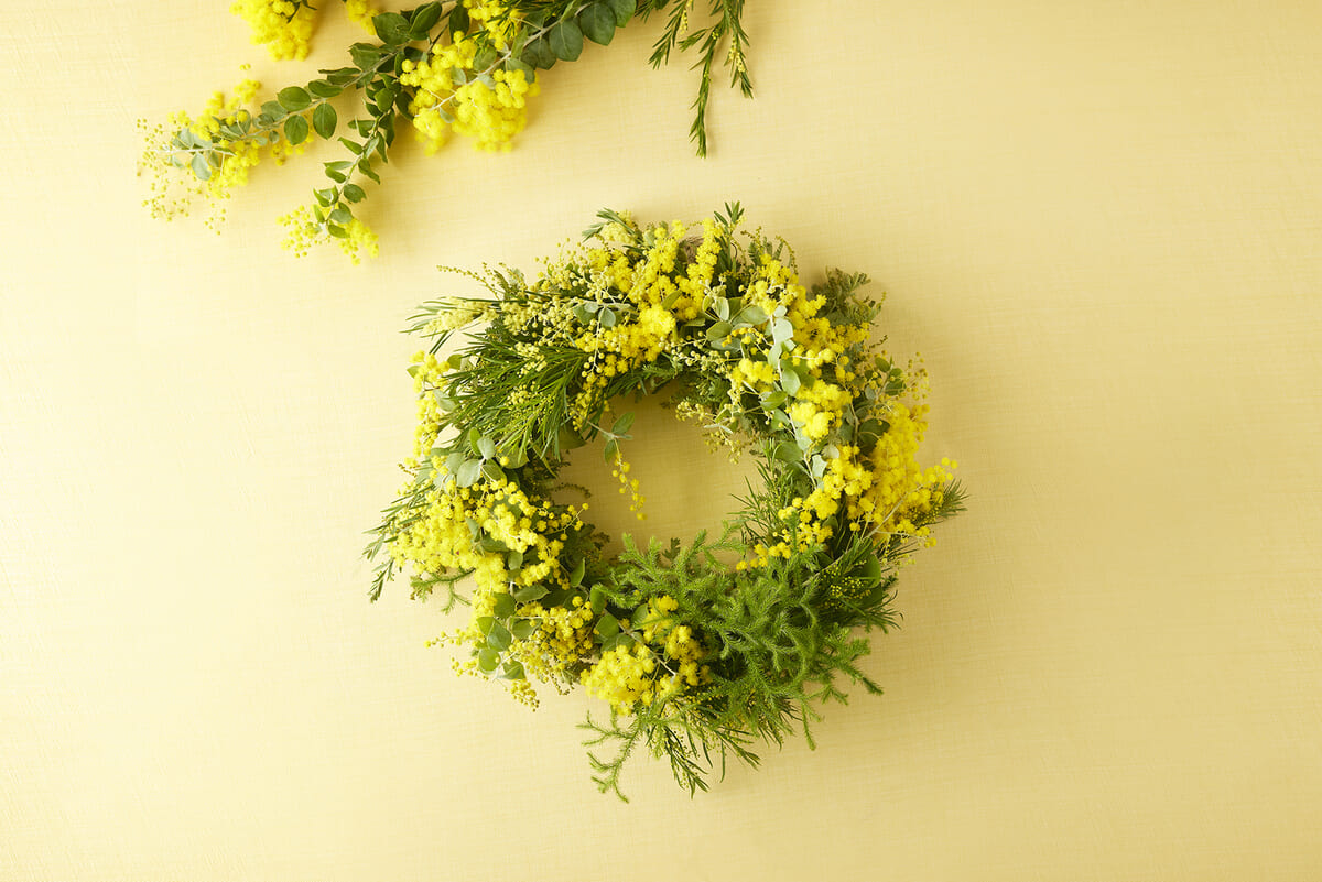 鮮やかなミモザのイエローを楽しめるフラワーリース作りを体験でき、お土産もついたチャリティー企画です☆