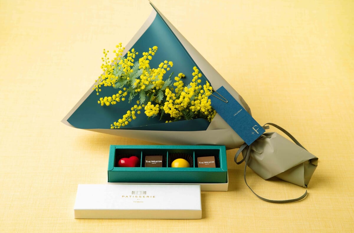 フラワーショップ「+F」による鮮やかな色合いのミモザのブーケとセットになったチョコレートギフト。