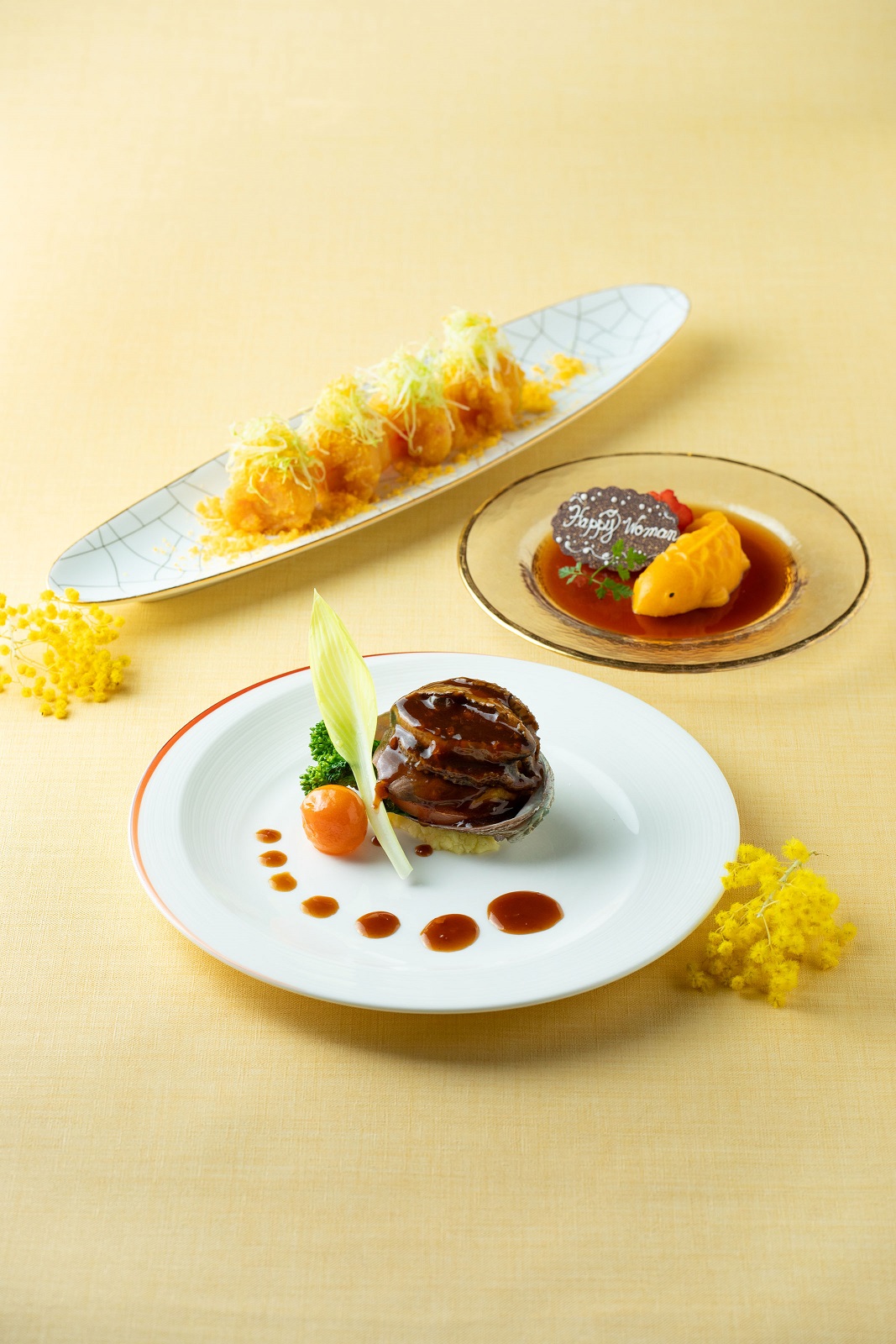 ホテル2階の広東料理「龍天門」では、イエローの食材を使った彩り華やかな料理を用意。