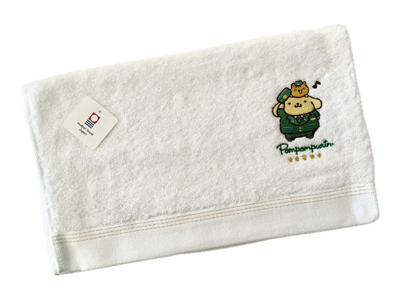 「ポムポムプリン」のワインポイントが刺繍された、やわらかい肌触りの今治タオル。