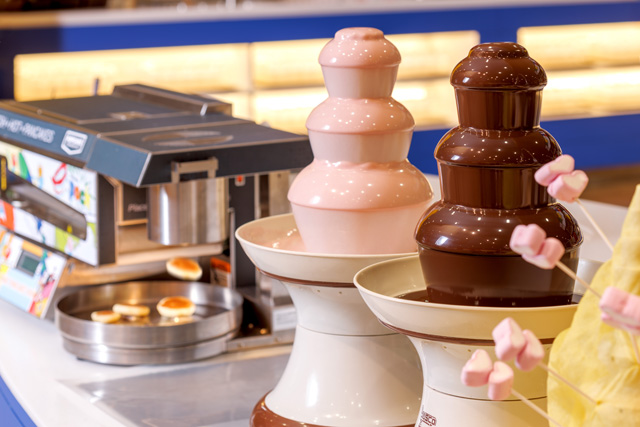 自動パンケーキマシーンで焼き上げた一口サイズのパンケーキや、見た目もキュートなハート型のマシュマロにストロベリーチョコレートを絡めて味わえます☆