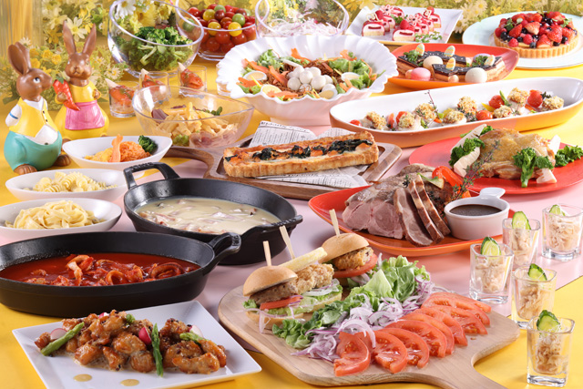 メニュー例:ポークフリット キヌア入りしょうがクリーミィソース/太刀魚の香草パン粉焼き/アレンジパスタコーナー/チキンソテー菜の花と筍のペッパーソース/ほぐし鶏の棒棒鶏ソース/スモークトラウトサーモンと筍のジェノバソース/イチゴとベリーのタルト/ドーム・オ・フランボワ/イースターバニープリン/抹茶ロールケーキ/ダブルチョコレートファウンテン(ストロベリー&ダーク) 等