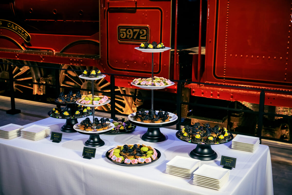 ディナーの後は、それぞれのペースでスタジオツアーを巡り、ツアーの折り返し地点である9と3/4番線にて、スイーツとお飲み物を楽しむデザートタイムも用意。