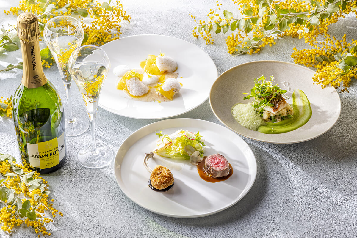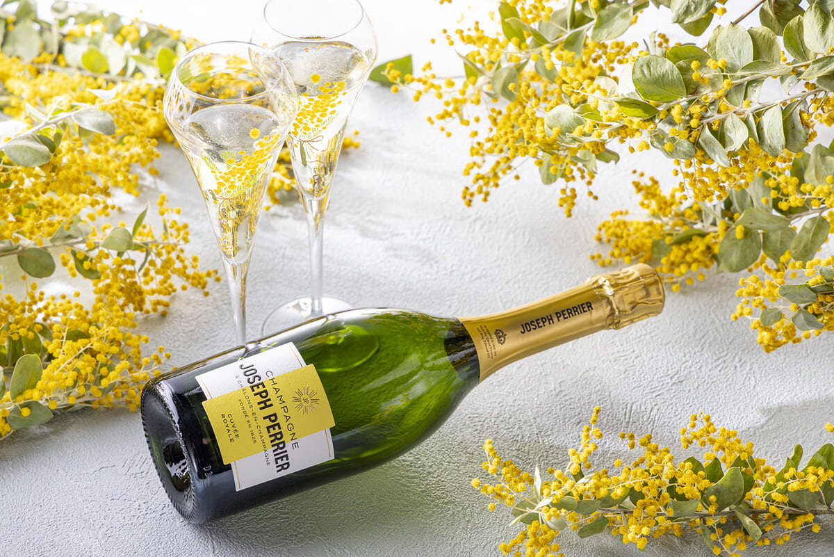 ミモザコースと一緒に楽しめる、ミモザがあしらわれたシャンパーニュ ジョセフ・ぺリエを、期間限定で提供。