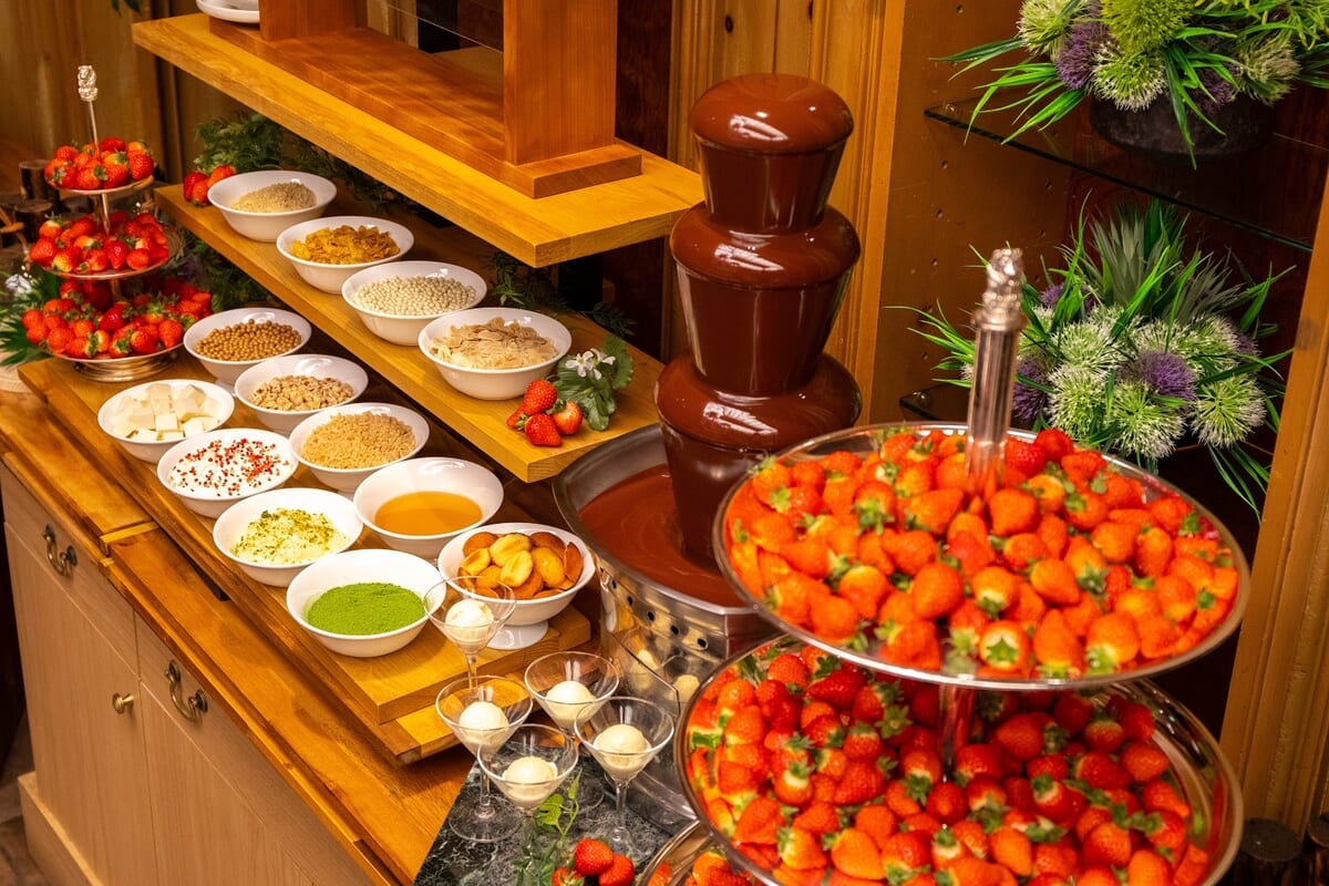 そのほか、シャンテリー(生クリーム)やチョコレートファウンテン、抹茶パウダーにナッツなどが苺の魅力を引き出します!