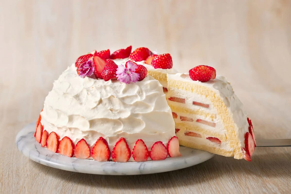 イチゴが断面からも見え、一口ごとに爽やかな香りが広がるクリームを纏った、見た目にもかわいらしいケーキです。