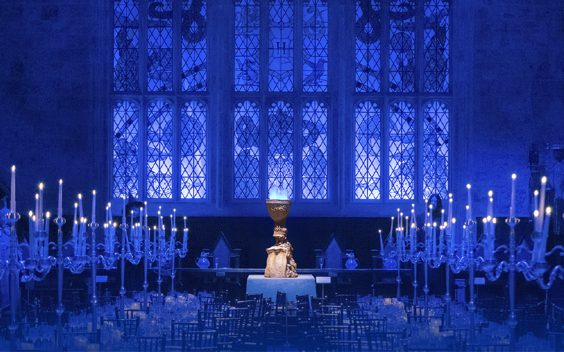 映画「ハリー・ポッター」シリーズのなかで最も古く、最も大きなセットである大広間に足を踏み入れると、その中央に、青い炎が揺らめくゴブレットが出現。