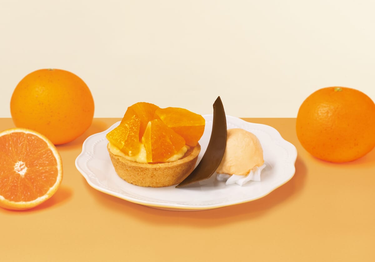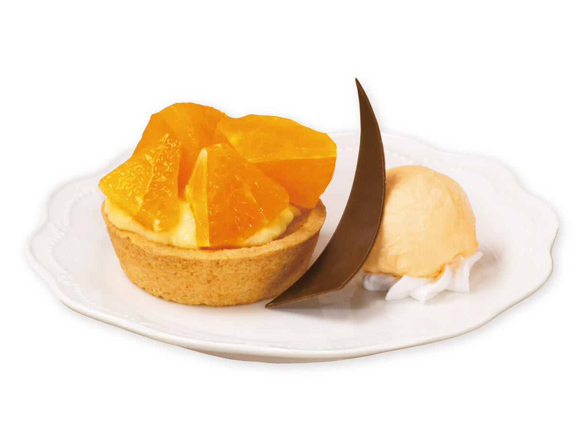 舌触り滑らかなカスタードクリームが、ジューシーでみずみずしい清見オレンジと、サクサク・ホロホロとしたタルトと調和。爽やかな春のスイーツに仕上げられています。