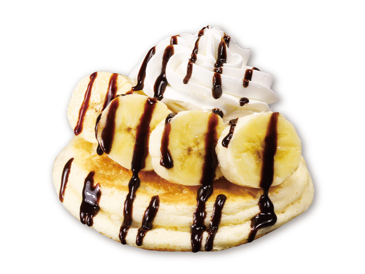 食後のデザートに合うよう、さわやかな風味のリコッタチーズやメレンゲを使用し、軽やかな口当たりでふわふわ食感のパンケーキに仕上げられた「チョコバナナパンケーキ」