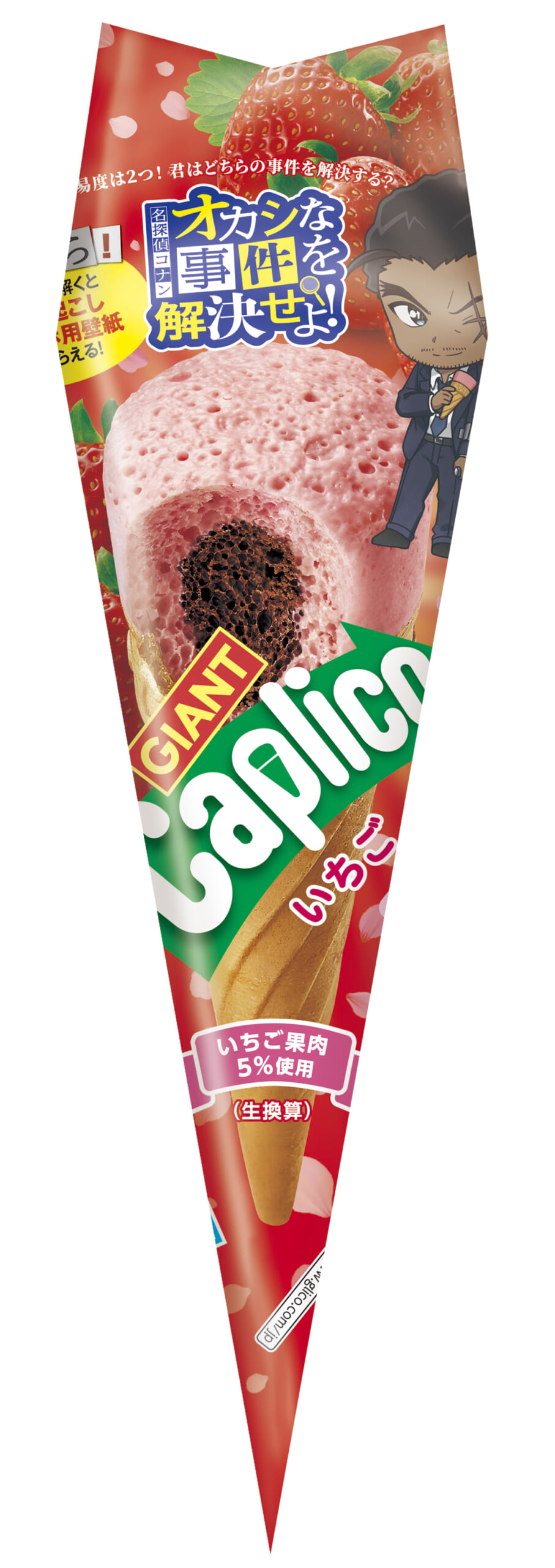 劇場版『名探偵コナン 隻眼の残像(フラッシュバック)』での活躍に期待が高まる、長野県警の警部「大和敢助」が「ジャイアントカプリコ<いちご>」を持つ姿がプリントされています。