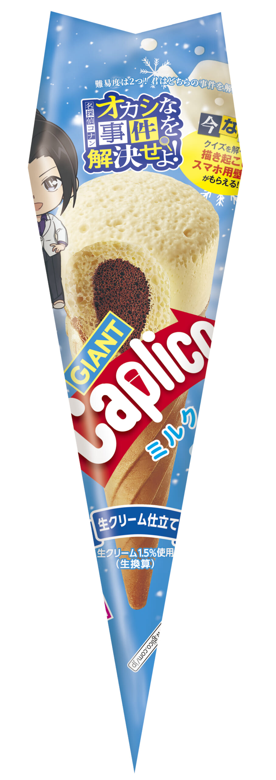 「灰原哀」が「ジャイアントカプリコ<ミルク>」を手に微笑む姿が落とし込まれています。
