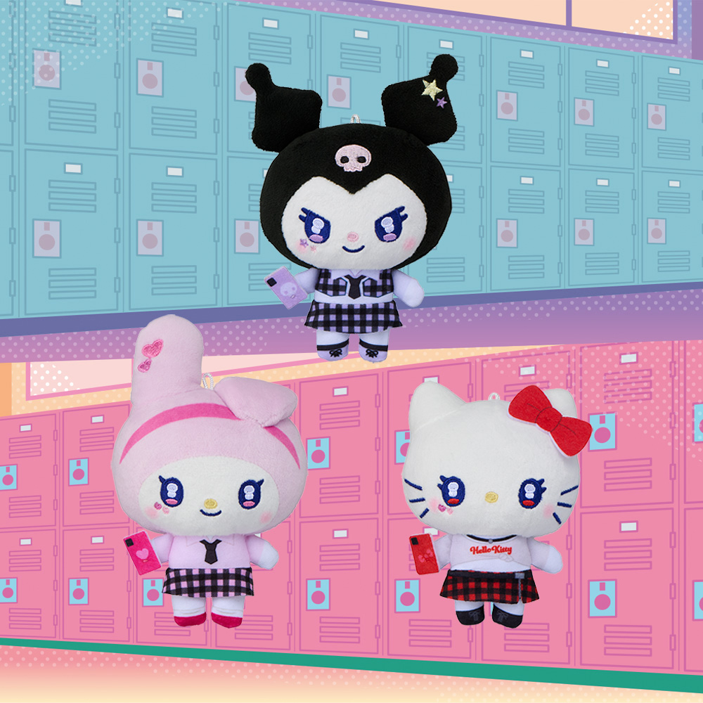 優等生風の制服に身を包んだ、変身前の「クロミ」「マイメロディ」「ハローキティ」のマスコットです。