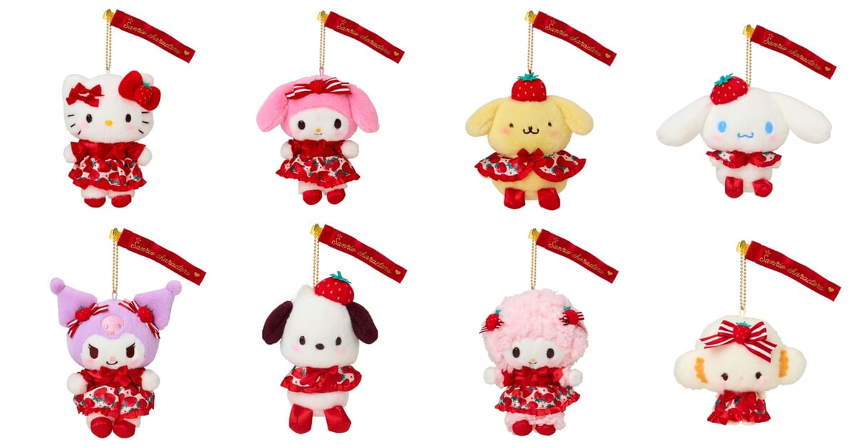 いちご柄のコスチュームや立体のいちごやリボンがポイントのマスコットホルダー。