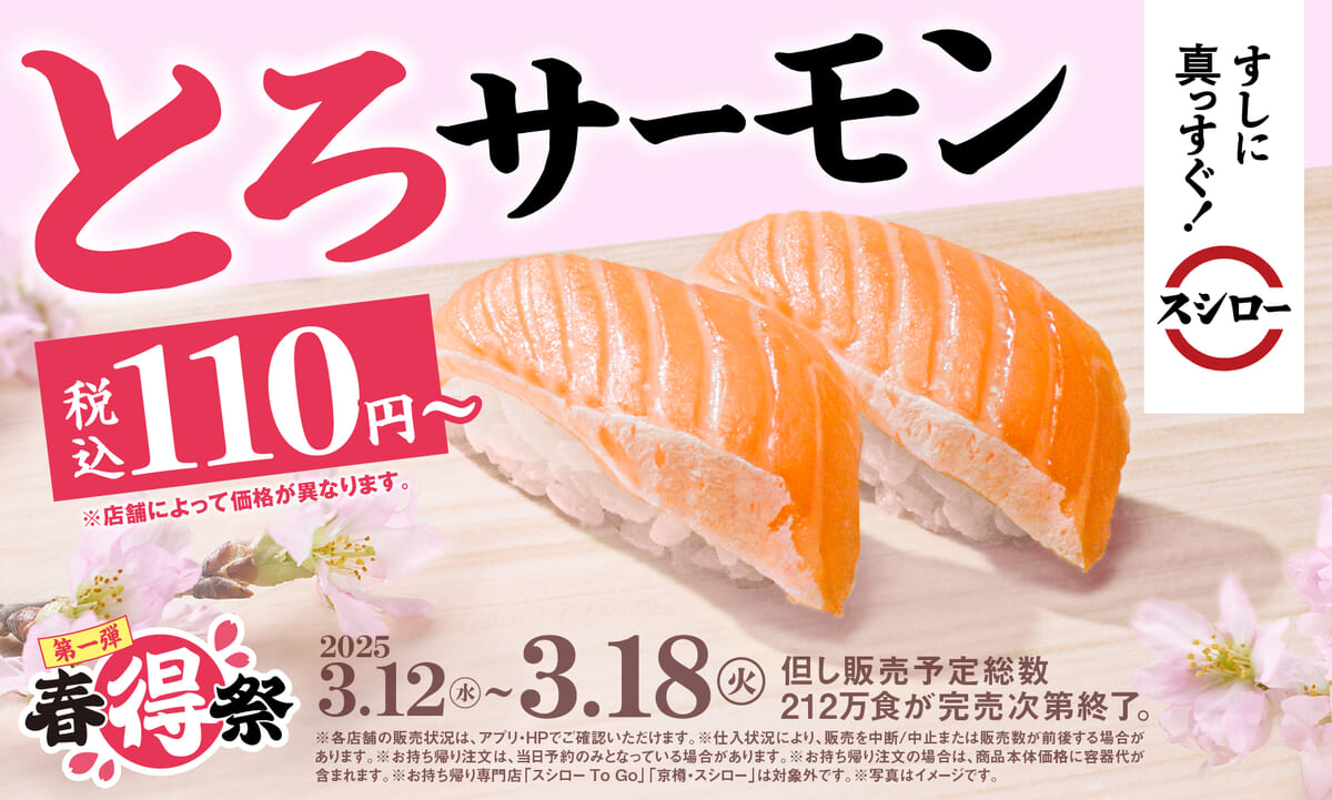 2025年3月12日から開催される「春得祭 第1弾」では、まぐろの旨みを存分に楽しめる「大切り厳選まぐろ赤身」と、脂のり抜群の「とろサーモン」が税込み110円~より提供されます。