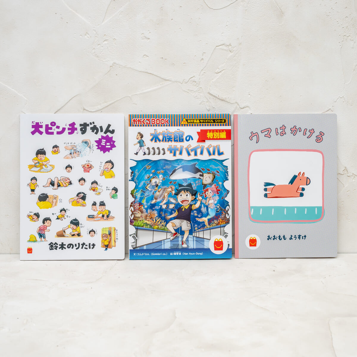 マクドナルド「ほんのハッピーセット」ミニ図鑑「大ピンチずかん ミニ」/マンガ「科学漫画サバイバルシリーズ 水族館のサバイバル 特別編」/絵本「ウマはかける」