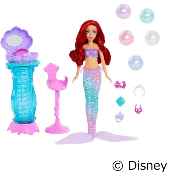 さらにドレスアップが楽しめる「ディズニープリンセス おへやでビーチ☆マーメイドアリエル」と「ディズニープリンセス アリエル しんじゅがポンッ!きらきらドレッサー」がラインナップ。