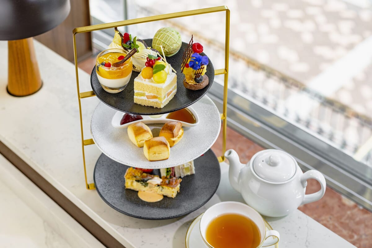 ラウンジ「シーウインド」で人気のアフタヌーンティーも、旬のメロンと爽やかな柑橘系フルーツをテーマにしたものを提供。