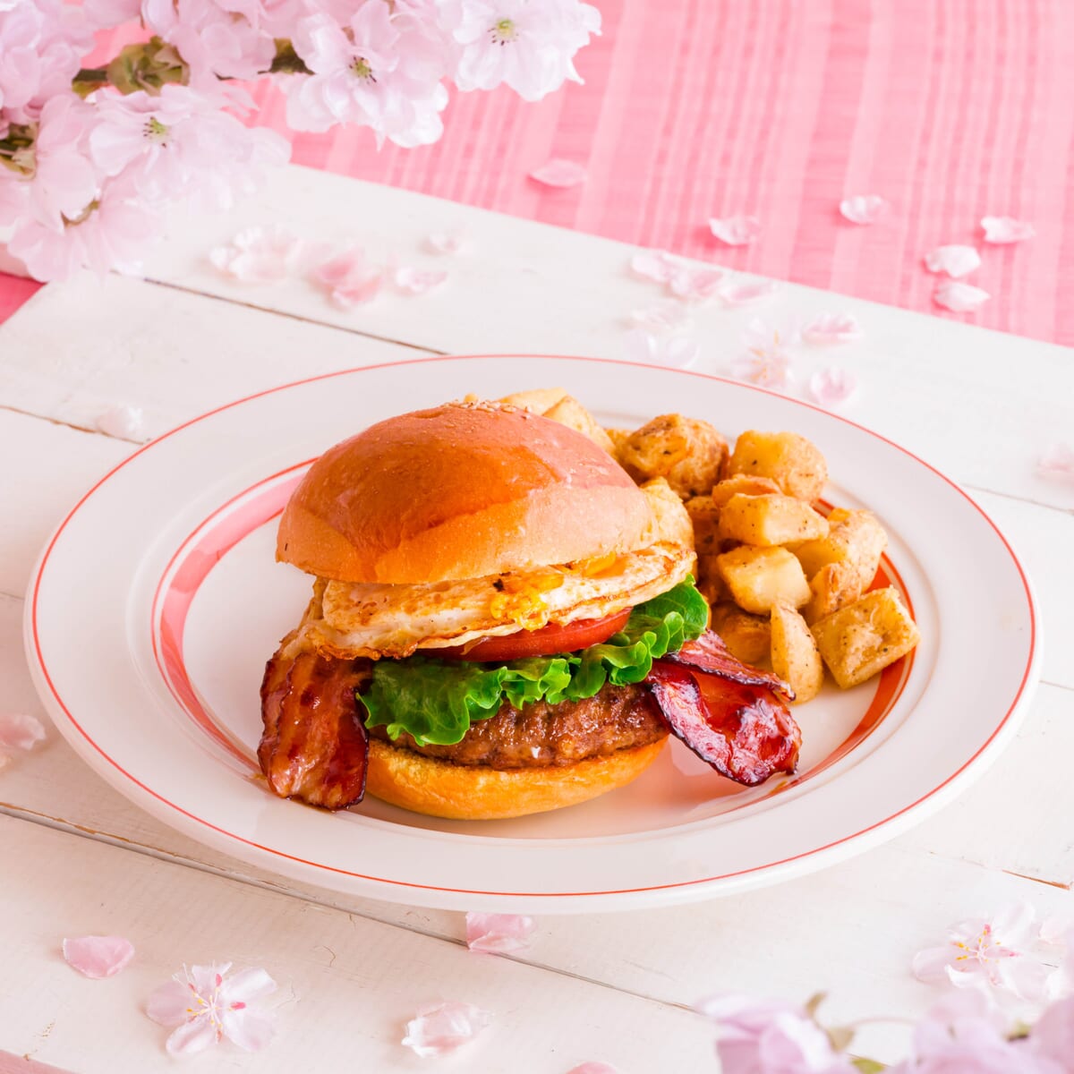 桜の香りで香ばしく焼き上げた桜スモークベーコンと100%ビーフパティ、そして目玉焼きを挟んだボリューム満点のハンバーガーです。