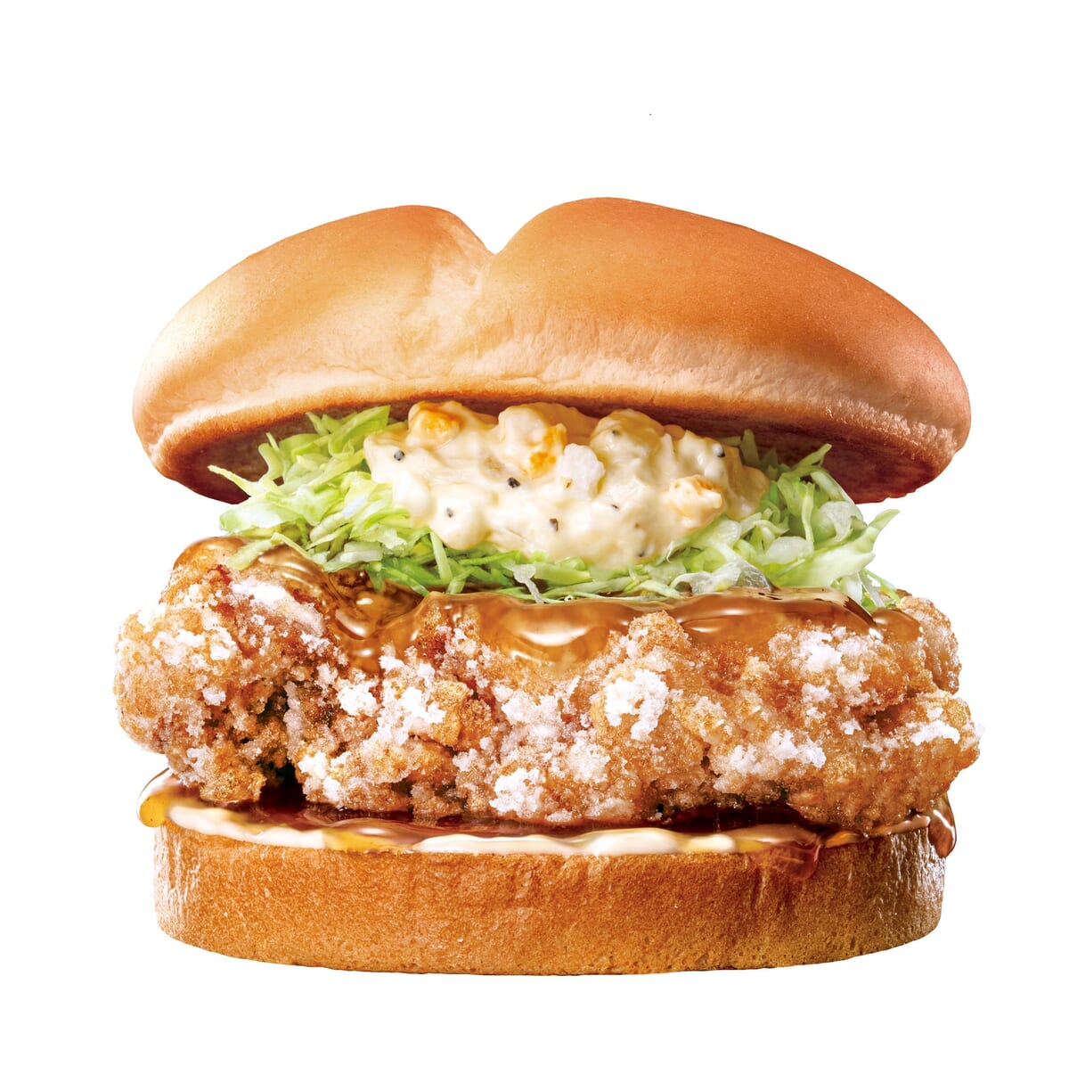 醤油ベースのタレに漬け込んだ鶏モモ肉を、店内で1枚ずつ衣付けして揚げたチキン竜田を使った「タルタルチキン 竜田バーガー」