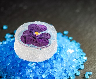 “花の宝石”のようにきらめく小菓子で、食後の余韻を優雅に彩る一品。