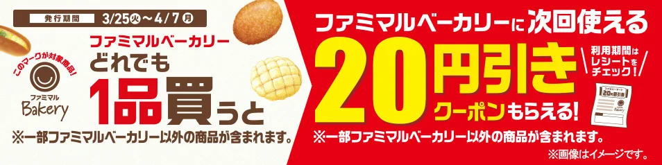 どれでも1品購入で、ファミマルBakery(ファミマルベーカリー)のパン全品に次回使える20円引きレシートクーポンがもらえます。