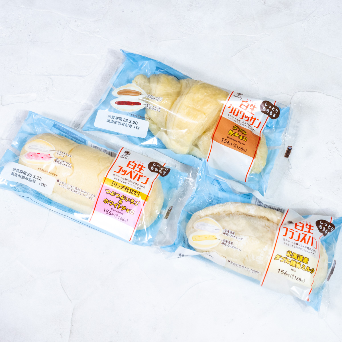 「白生コッペパン(つぶつぶいちご&ホワイトチョコ)」「白生クロワッサン(ダブル生チョコ)」「白生フランスパン(北海道産ダブル練乳ミルク)」の3種類がラインナップされています☆