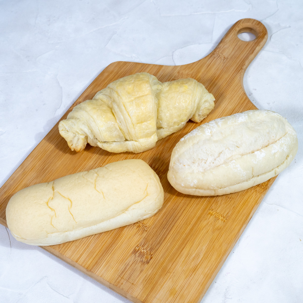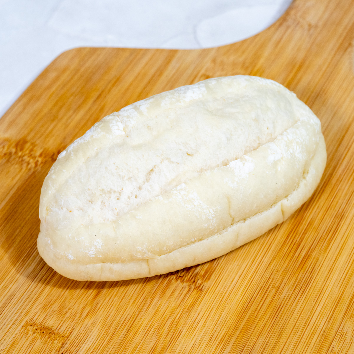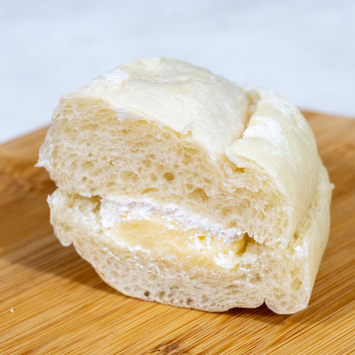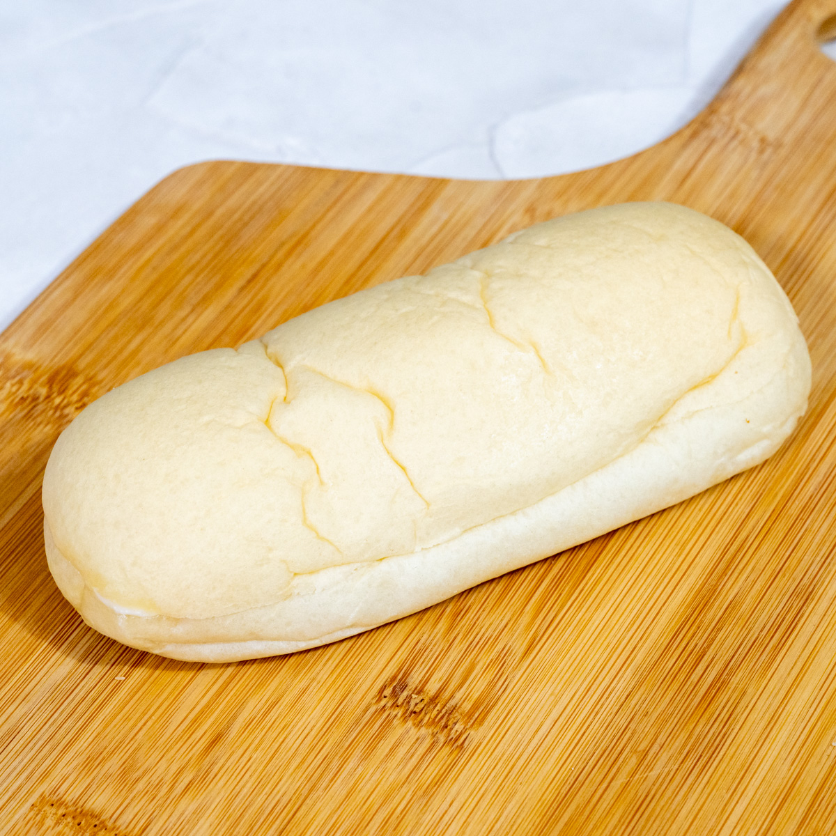 生クリームを加えたもちっと生地を低温で焼き上げることでしっとりもちもちとした食感の白いコッペパン。