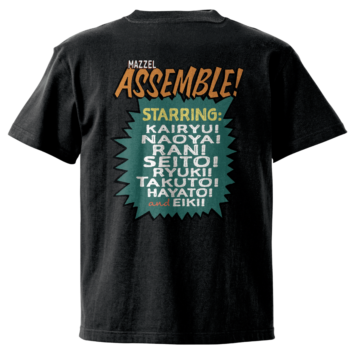 背面にはMAZZELメンバーのKAIRYU、NAOYA、RAN、SEITO、RYUKI、TAKUTO、HAYATO、EIKIのロゴが大胆にプリントされています。