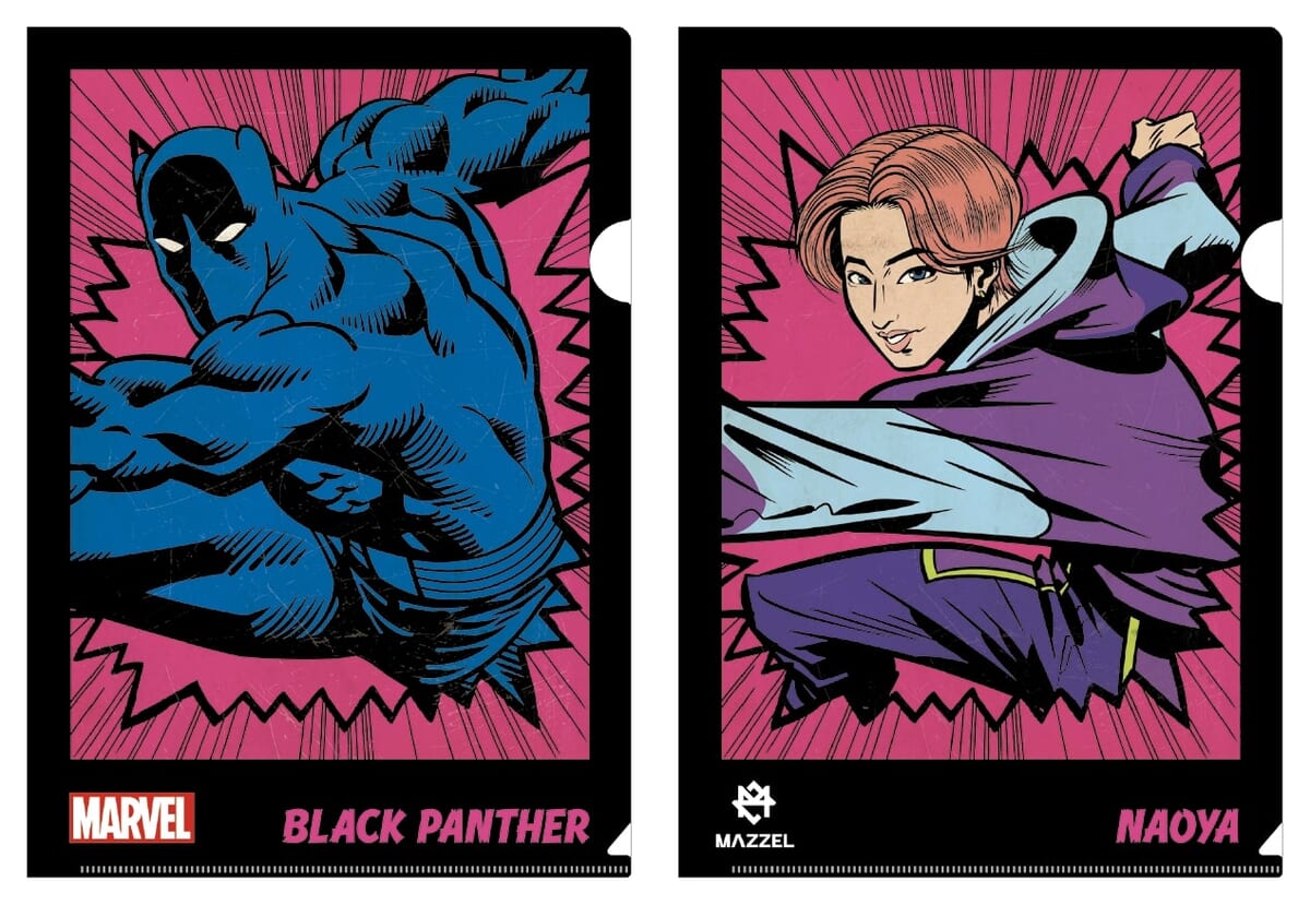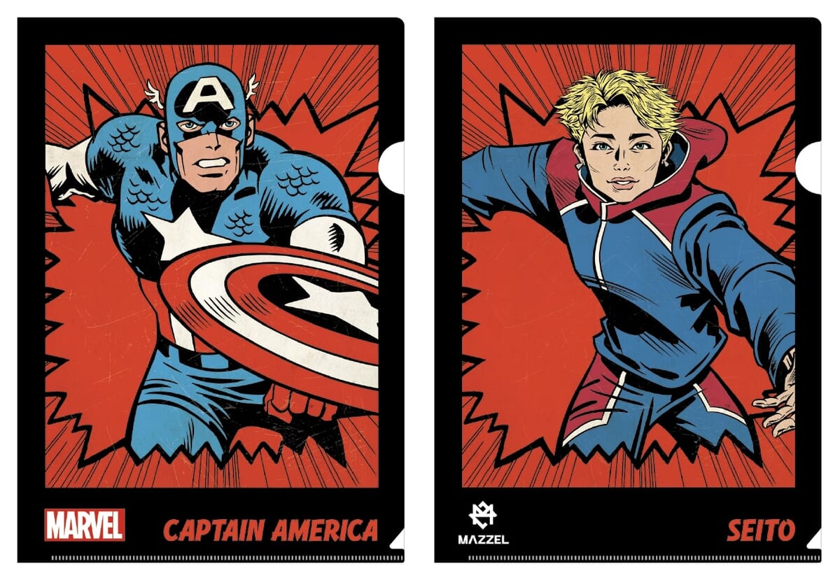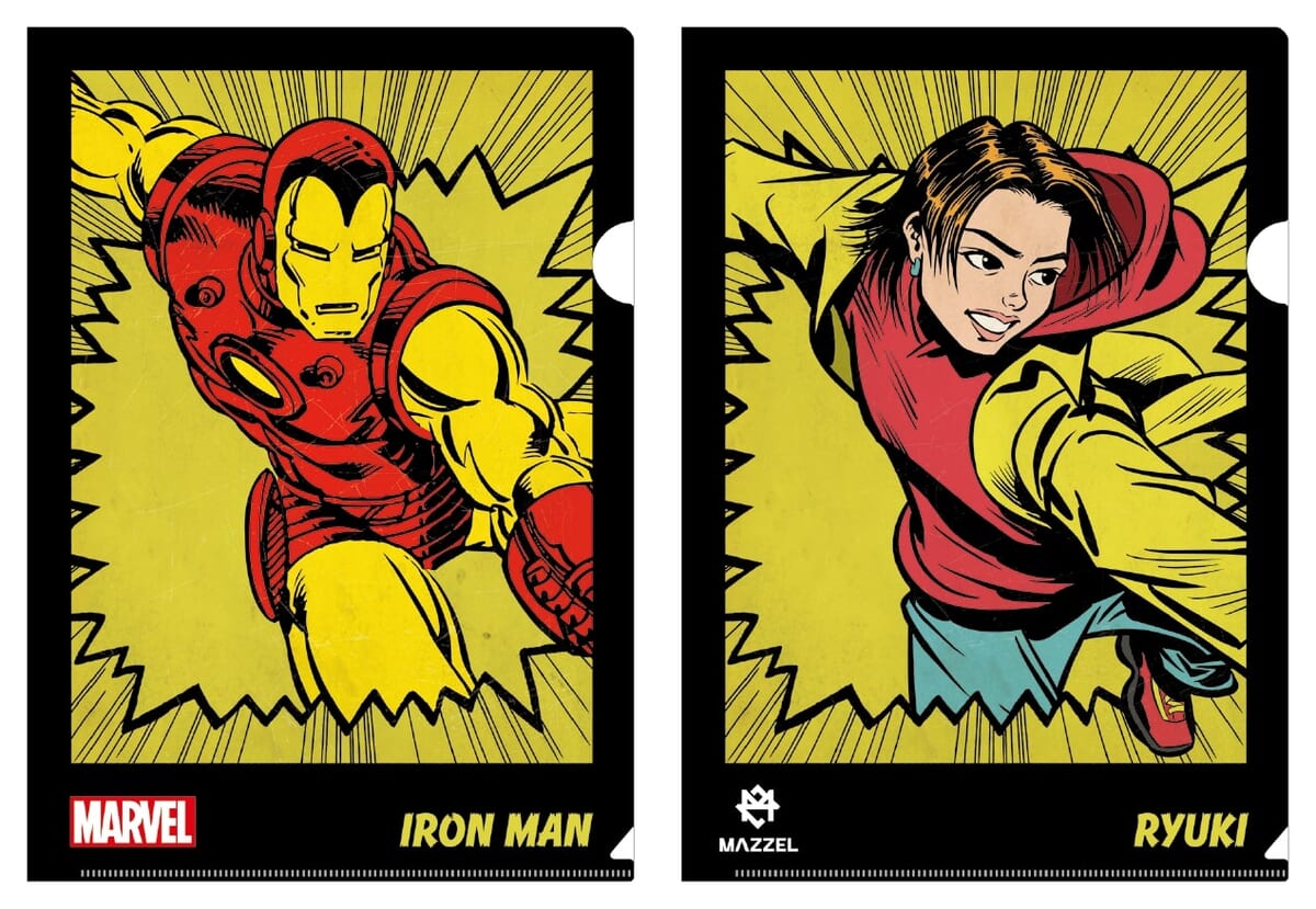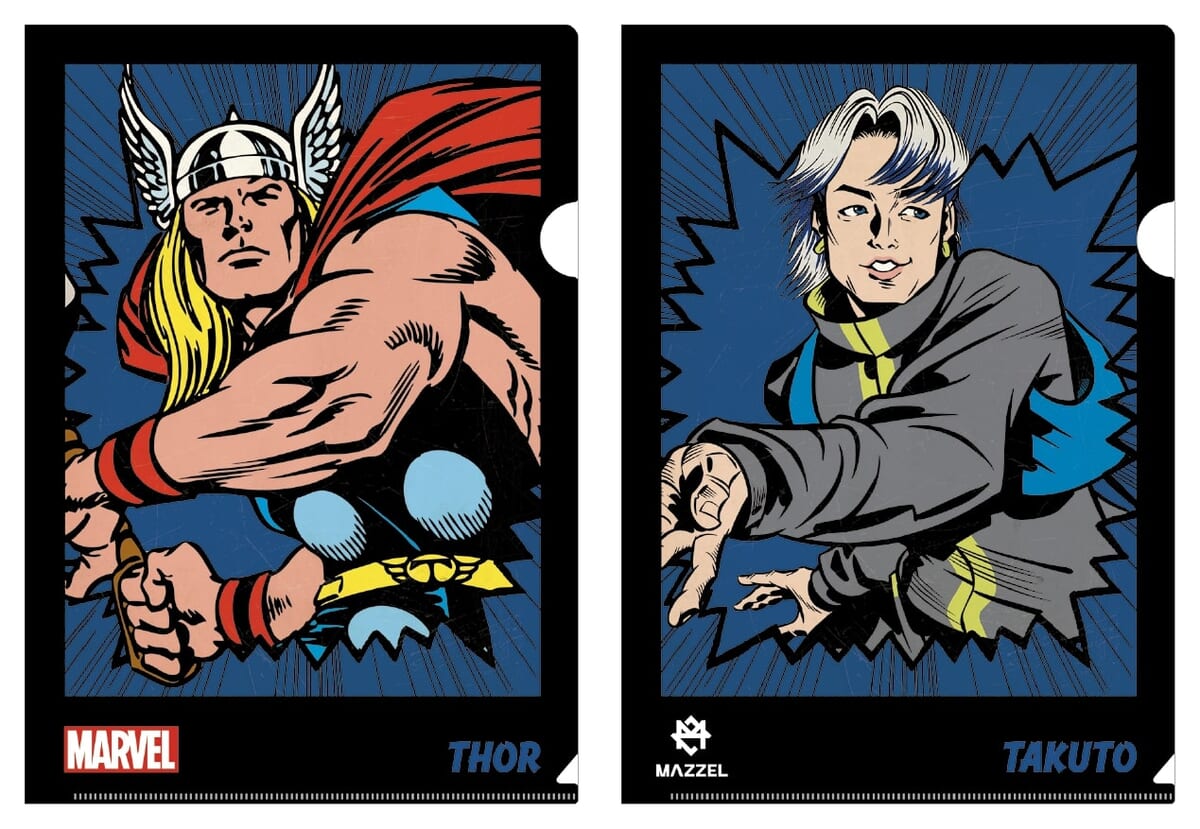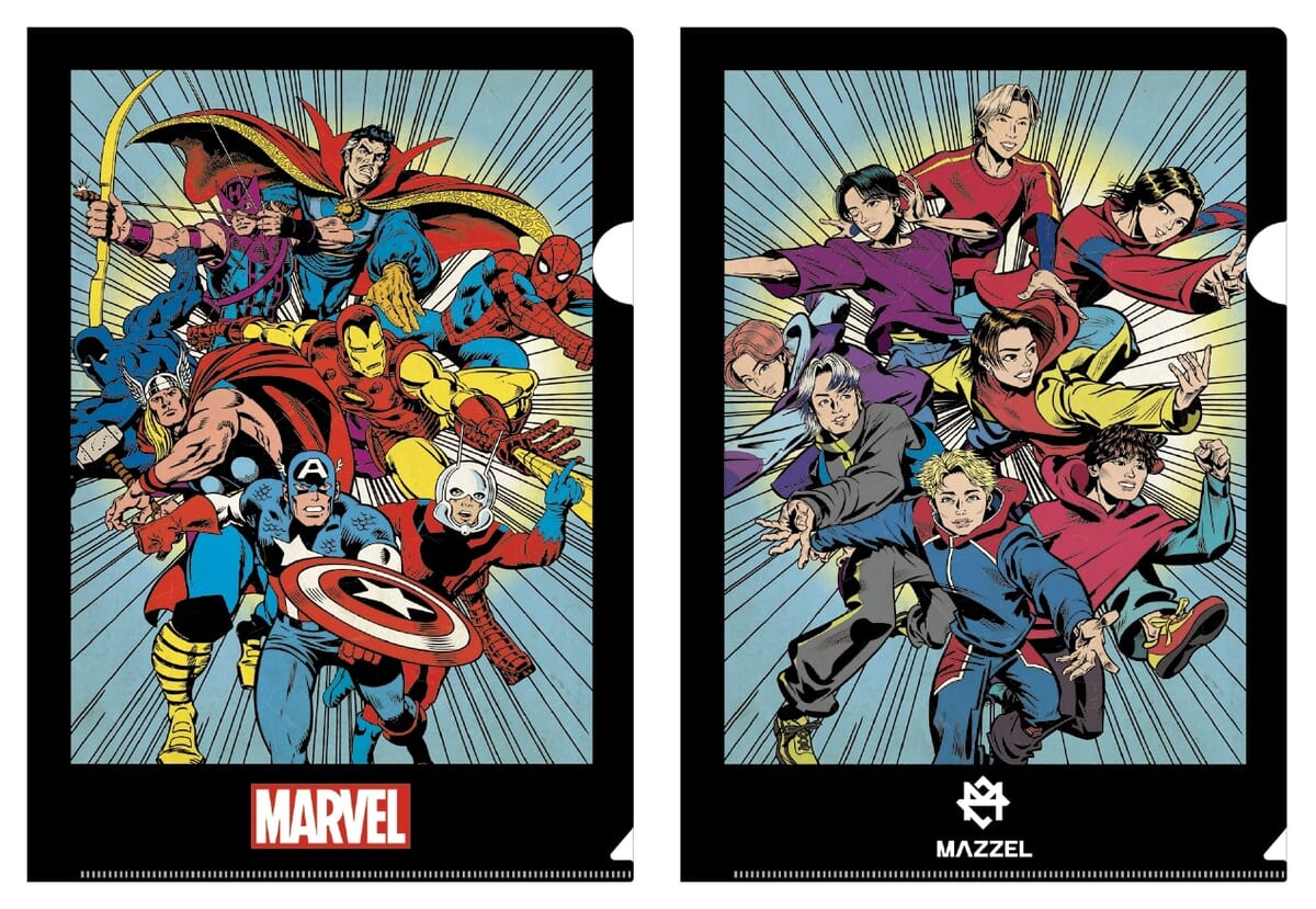 MARVELヒーローとMAZZELの2枚がセットになった、A4サイズのクリアファイル。