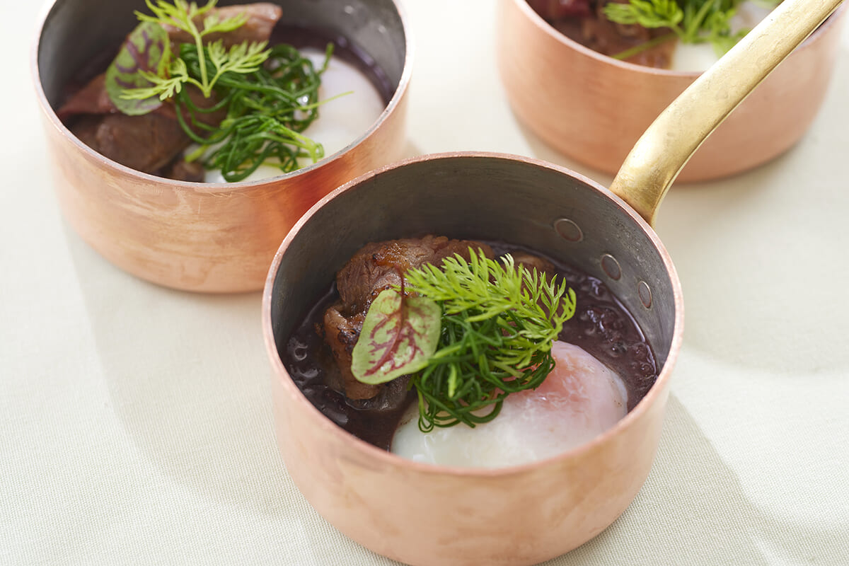さらに、フランス・ブルゴーニュ地方の卵料理をアレンジした「ウフ・アン・ムーレット 黒毛和牛の焼きしゃぶ添え SUKIYAKI風」も登場します。