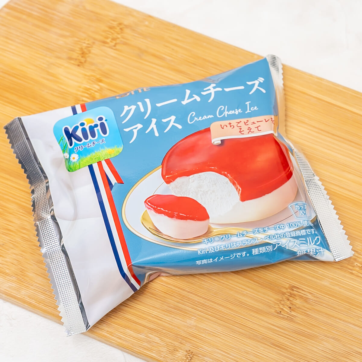 「Kiri クリームチーズ」を、チーズ中100%使用した「クリームチーズアイス」は、チーズと相性が良いいちごピューレをのせています。