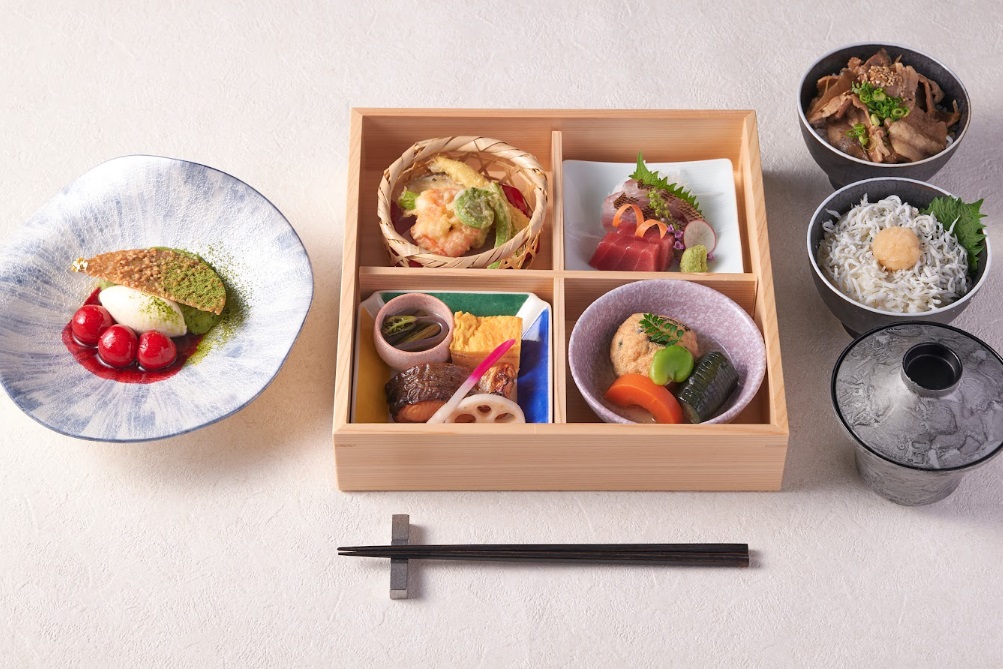 神奈川県産の鱒の柚庵焼きや季節野菜の天ぷらのほか、釜揚げしらすにやまゆりポーク 、三崎港で水揚げされた鮮魚を使った彩り豊かな一折です。