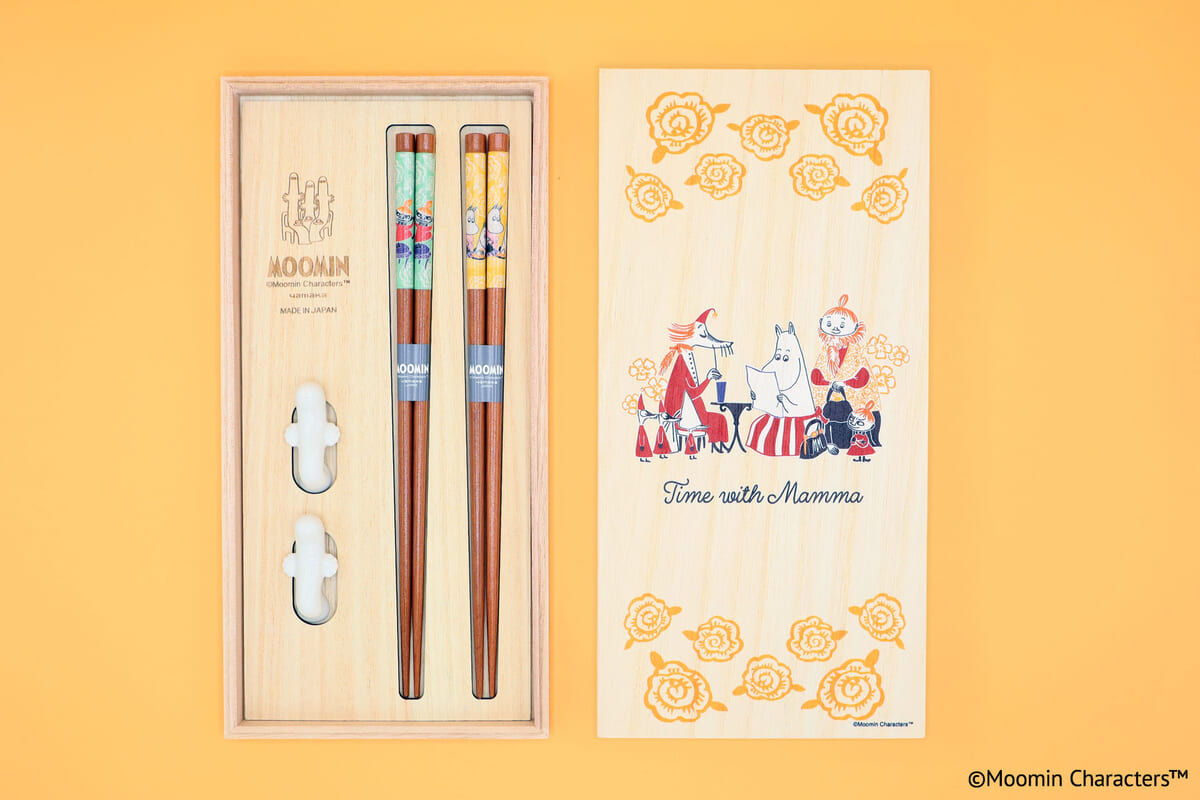 「ムーミンママ」たちが描かれたお箸に、「ニョロニョロ」の箸置きがセットになったペア箸セット。