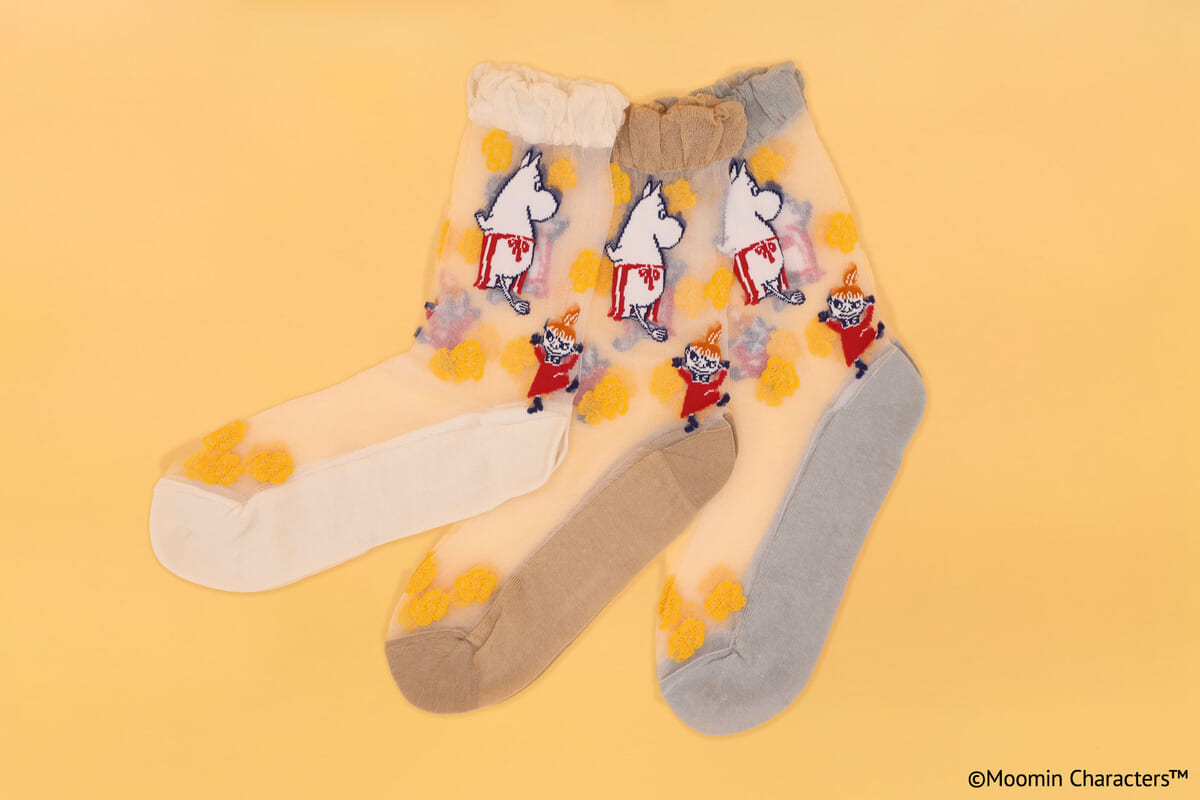 「ムーミンママ」と「リトルミイ」が描かれた、やさしいデザインのシースルーソックス。
